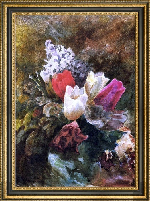 16" x 24" John La Farge Tulips and Hyacinths framed premium canvas print reproduced to meet museum quality standards. Our Museum quality canvas prints are produced using high-precision print technology for a more accurate reproduction printed on high quality canvas with fade-resistant, archival inks. Our progressive business model allows us to offer works of art to you at the best wholesale pricing, significantly less than art gallery prices, affordable to all. This artwork is hand stretched onto wooden stretcher bars, then mounted into our 3 3/4" wide gold finish frame with black panel by one of our expert framers. Our framed canvas print comes with hardware, ready to hang on your wall. We present a comprehensive collection of exceptional canvas art reproductions by John La Farge.