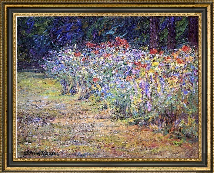 18" x 24" John Ottis Adams Flower Border framed premium canvas print reproduced to meet museum quality standards. Our Museum quality canvas prints are produced using high-precision print technology for a more accurate reproduction printed on high quality canvas with fade-resistant, archival inks. Our progressive business model allows us to offer works of art to you at the best wholesale pricing, significantly less than art gallery prices, affordable to all. This artwork is hand stretched onto wooden stretcher bars, then mounted into our 3 3/4" wide gold finish frame with black panel by one of our expert framers. Our framed canvas print comes with hardware, ready to hang on your wall. We present a comprehensive collection of exceptional canvas art reproductions by John Ottis Adams.