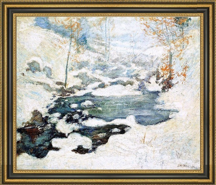 20" x 25" John Twachtman Icebound framed premium canvas print reproduced to meet museum quality standards. Our Museum quality canvas prints are produced using high-precision print technology for a more accurate reproduction printed on high quality canvas with fade-resistant, archival inks. Our progressive business model allows us to offer works of art to you at the best wholesale pricing, significantly less than art gallery prices, affordable to all. This artwork is hand stretched onto wooden stretcher bars, then mounted into our 3 3/4" wide gold finish frame with black panel by one of our expert framers. Our framed canvas print comes with hardware, ready to hang on your wall. We present a comprehensive collection of exceptional canvas art reproductions by John Twachtman.