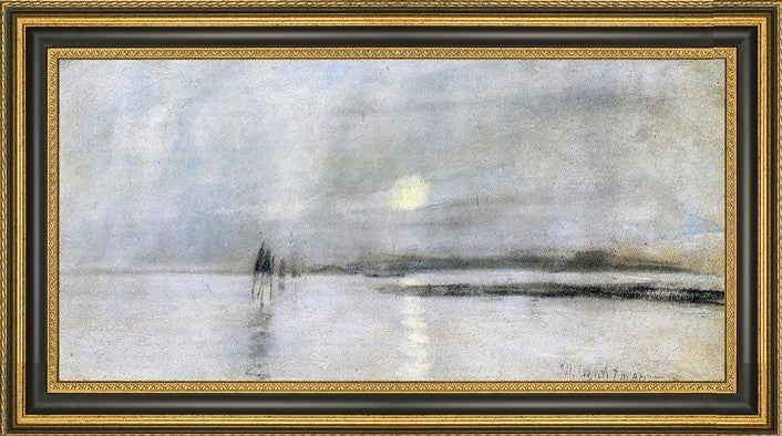 14" x 28" John Twachtman Moonlight Flanders framed premium canvas print reproduced to meet museum quality standards. Our Museum quality canvas prints are produced using high-precision print technology for a more accurate reproduction printed on high quality canvas with fade-resistant, archival inks. Our progressive business model allows us to offer works of art to you at the best wholesale pricing, significantly less than art gallery prices, affordable to all. This artwork is hand stretched onto wooden stretcher bars, then mounted into our 3 3/4" wide gold finish frame with black panel by one of our expert framers. Our framed canvas print comes with hardware, ready to hang on your wall. We present a comprehensive collection of exceptional canvas art reproductions by John Twachtman.