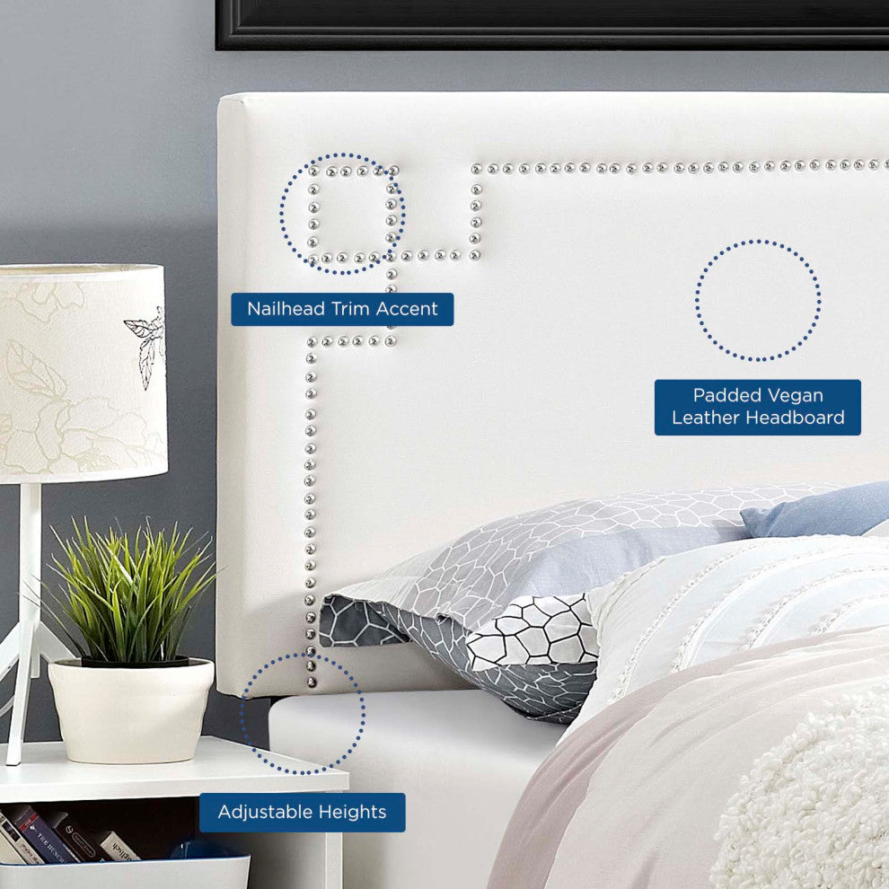 Enhance decor with the elegant Josie Headboard in Vinyl. Fashioned with diamond-patterned silver accent nail buttons, Josie features a solid wood frame, adjustable black coated metal legs, and dense foam padding for ultimate support. Designed to delight, Josie is a glamorous-Piece that complements traditional, contemporary and modern bedrooms admirably. Fully Compatible with Loryn and Tessie Platform Bed Frames.Set Includes:One - Josie Twin Headboard Overall Product Dimensions: 3"L x 42.5"W x 47.5"H
