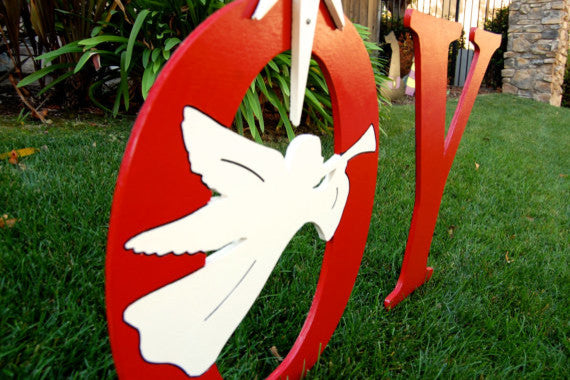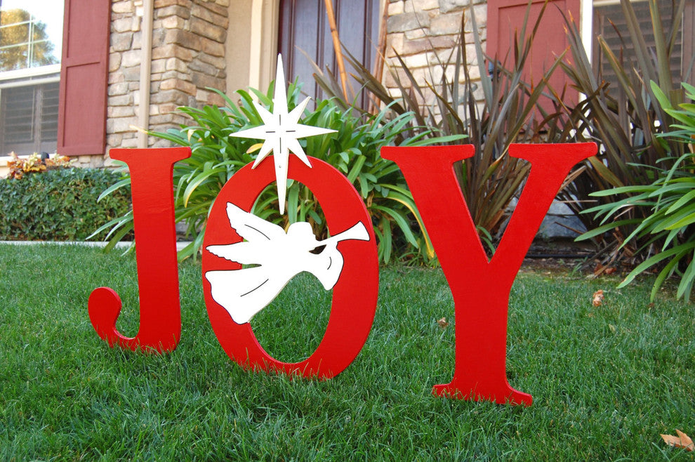 Another version of our very popular Joy sign. This one has a beautiful angel cut and engraved on the O of Joy and topped with the norther star. The letters J, O, Y are painted a vibrant red that contrast nicely with the white angel.This sign looks great in the daytime as well as the night. Place a spot light on it and it''s sure to be noticed.My yard art is made from the best materials I can find. I use a resign coated wood that won''t splinter and I paint my signs with three coats of exterior paint and seal all sides with a weather protectant sealer. The signs include durable steel stakes that make set up a breeze.Measurements:- J is 24" tall by 17" wide- O is 33" tall to the top of the star by 23" wide- Y is 24" tall by 20" wide - Star is 16" tall by 12" wideDetails:- cut out of high quality resin coated wood made for outdoor sign use - hand painted with high gloss exterior paint- sealed with an all weather sealer - includes attached steel stakes for lawn display - the back of the sign is painted black and weather resistant sealed