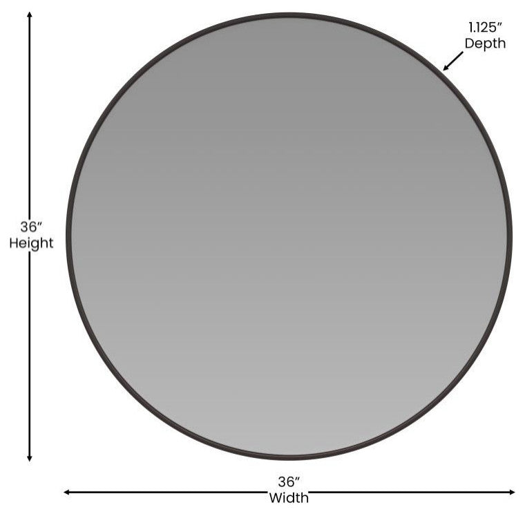 • Whether you''re updating your space or moving to a new one, gather natural light and make any room in your home seem bigger with this round wall mount mirror. The modern design boasts a slim, oxidized black aluminum frame that lends an aged look to blend in almost any decor. Silver backed 4mm glass provides high reflectivity for a distortion-free image. Modern mirrors are safety-minded for a better fit in homes with children and pets. Shatterproof backing technology ensures the glass stays put in case of accidental breakage to prevent cuts to small feet or paws. The waterproof and rust-resistant design make this large mirror ideal for use in high humidity areas such as bathrooms, kitchens, and balconies. The mounting hardware is included with your new mirror so you can install it as soon as you receive it. Clean with water followed by a dry cloth to maintain its great looks. • 36 Inch Round Wall Mount Accent Mirror• Slim Black Aluminum Frame for a minimalist look; Frame Thickness .3125"• 4mm Thick Silver Backed Glass is highly reflective• Waterproof and Rust Resistant ideal for high humidity areas• Shatterproof Safety Backing prevents flying glass if broken• Mounting Hardware Included for quick installation• Hanging mirror can be used as decor or as a vanity or bathroom mirror• Single Unit Weight: 22.5 lbs• Item Width: 36 Inches• Item Depth: 1.125 Inches• Item Height: 36 Inches