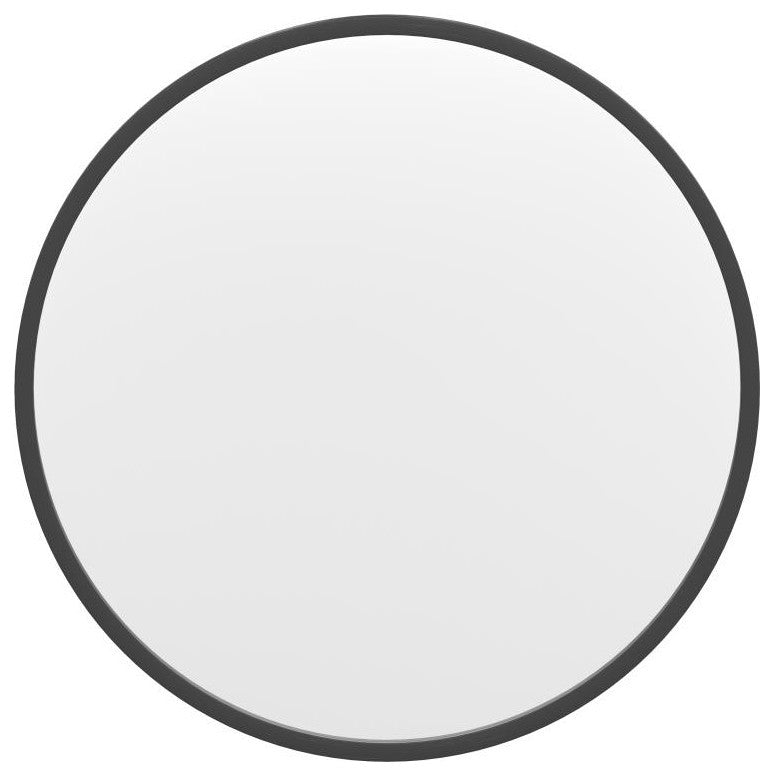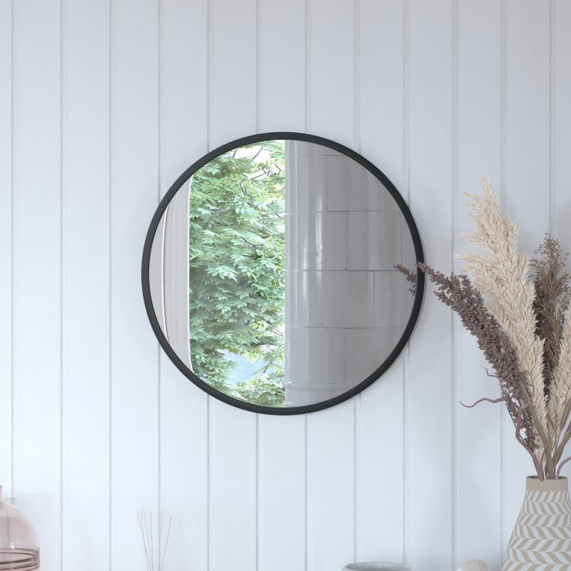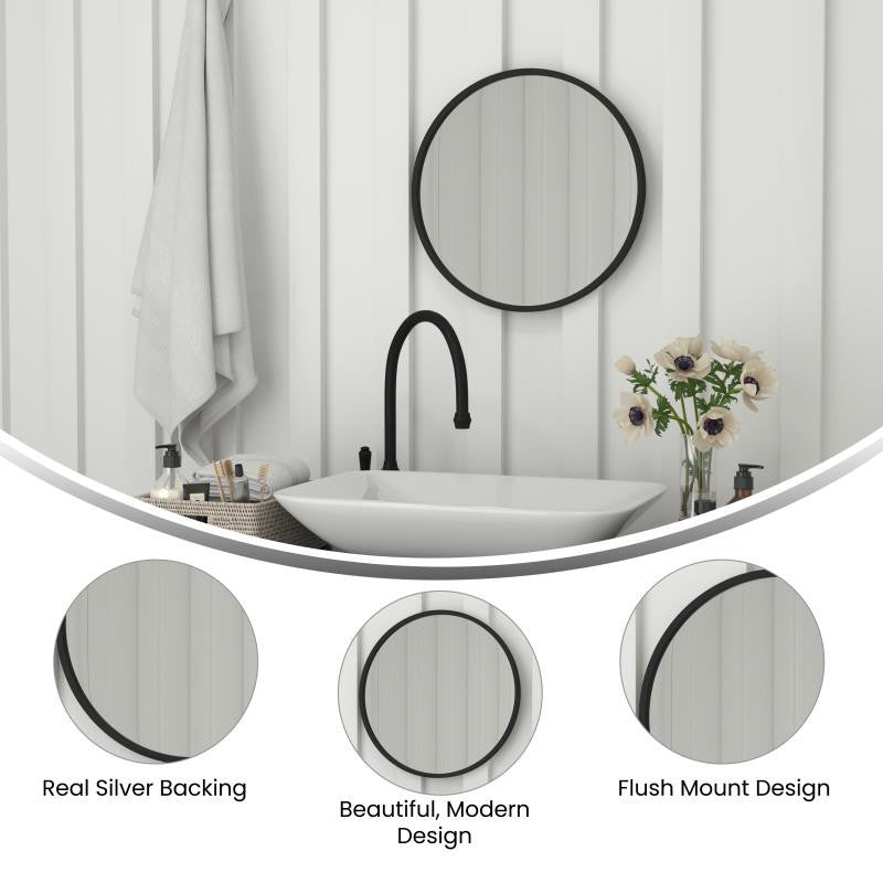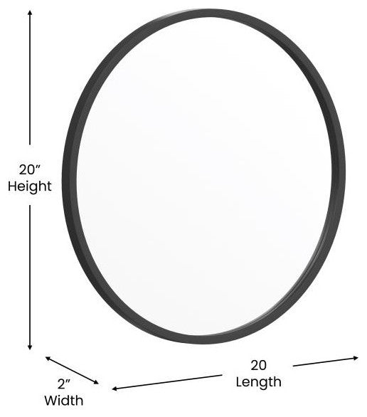 • Give any room in your home an instant refresh with this round wall mount mirror. The modern design boasts a slim, matte black metal frame that lends an up-to-date look to almost any decor. HD glass with real silver backing provides high reflectivity for a distortion-free image. Safety should always be first, especially in environments with children and pets. Shatterproof backing technology ensures the glass stays put in the frame when breakage occurs to prevent cuts. The waterproof and rust-resistant design make this large mirror ideal for use in high humidity areas such as bathrooms, kitchens, and sheltered balconies. With three types of mounting hardware included installation of your new looking glass can begin as soon as you receive it and this mirror wipes clean with a damp cloth. • Modern 20 Inch Round Wall Mount Accent Mirror• Slim Silhouette Black Metal Frame• Frame Thickness 0.78"• Real Silver Backed HD Glass• Shatterproof Backing for Safety• 3 Types of Mounting Hardware Included• Wall mount mirror for use as a vanity, accent, entryway, or bathroom mirror• Single Unit Weight: 8.25 lbs• Item Width: 20 Inches• Item Depth: 0.78 Inches• Item Height: 20 Inches