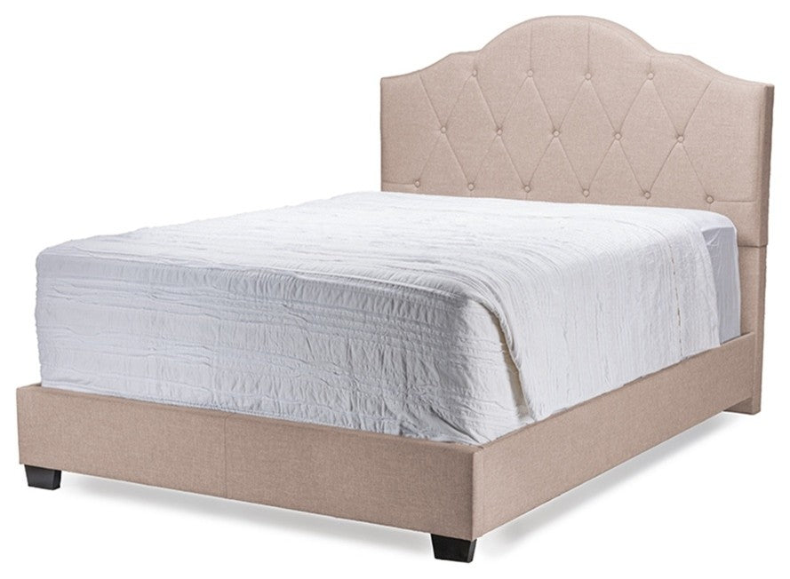 Upgrade your bedroom decor with the Juliet Arch Tufted Fabric Upholstered Bed. The tufted button accents leave a lovely diamond pattern. The king size bed set includes: One (1) headboard, one (1) footboard, one (1) set of rails, three (3) slats. Bed has quality wooden frame made with foam padding and supported by dark brown wood legs. Beautifully upholstery fabric scalloped headboard with diamond-shaped tufting, designs for the use of box spring. Available in your choice of colors: Gray and light brown.Features: • Finish: Brown • Headboard: 55.63"H x 78.25"W x 3.75"D • Material: Fabric "100% Polyester" and Rubber Wood • Top of Slat: 9.75" High • Residential Only • King Size Platform Bed (Slats Included; Box Spring Not Required) • Solid Rubberwood, Fabric, Foam • Box Spring is not RequiredSpecifications: • Product Dimensions: 55.63"H x 78.25"W x 86.35"D • Product Weight: 102 lbs • Weight Capacity: 250 lbs • Leg Dimensions: 2.63" High
