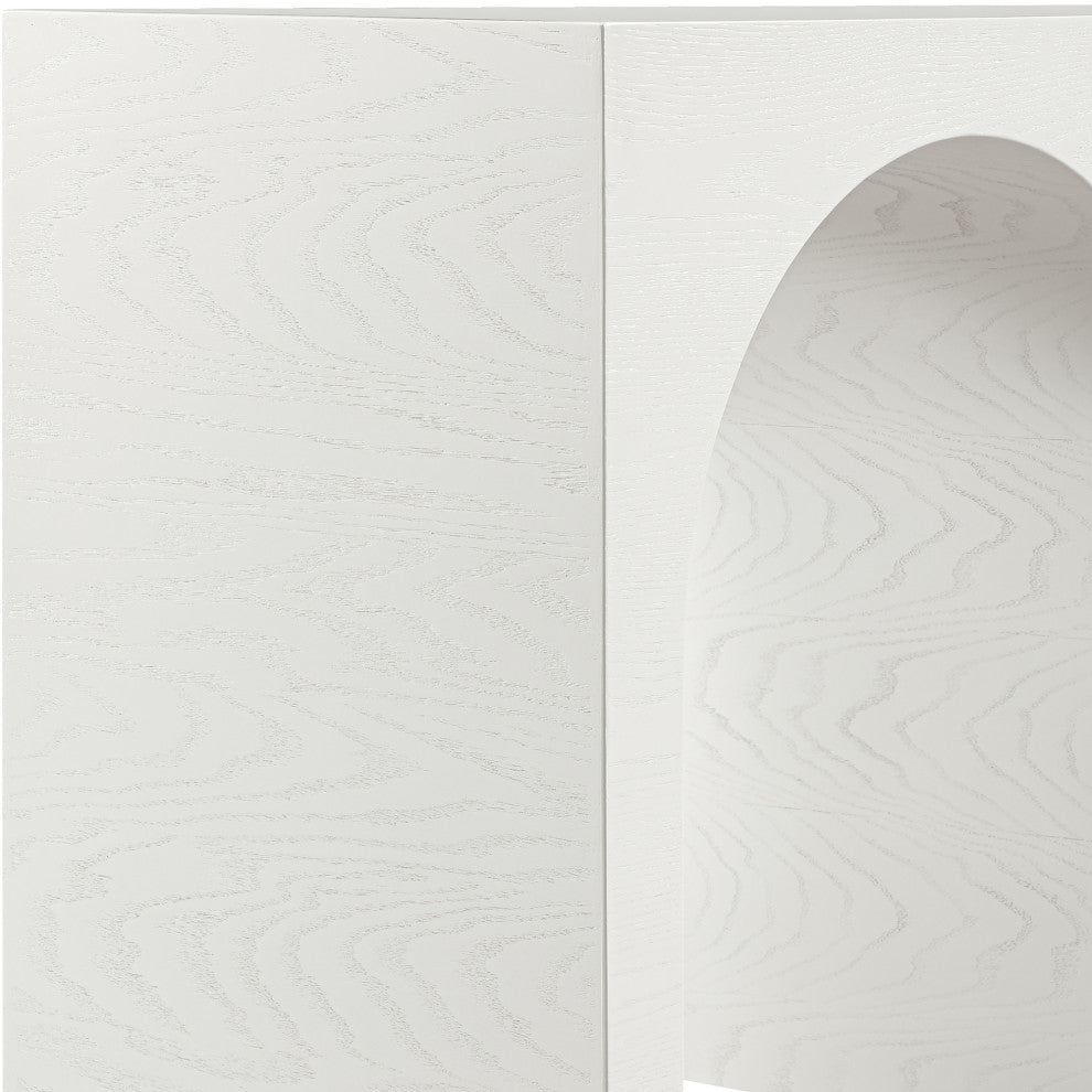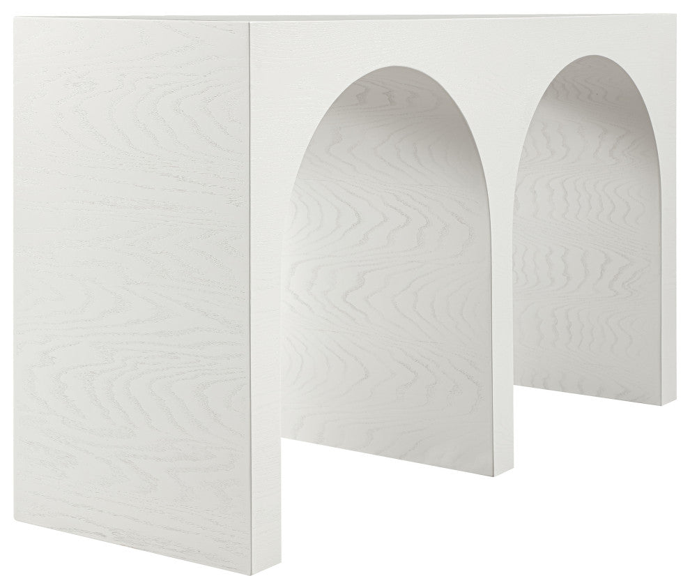 Modernize your home with this cream oak console table from our June collection. Its solid oak construction guarantees durability for years to come, while its cream finish goes with any existing home decor. Its double arch design is unique and is sure to become a favorite conversation piece. A flat surface provides space for decorative items such as vases, candles, and knick-knacks, or storage space for books, mail, and more. Its mid-century design is sure to liven up your home.Overall Product Dimensions: 54" W x 18" D x 30" HSolid White OakCream FinishMaximum Arch Width: 23"Maximum Arch Height: 27.25"Mid Century DesignNatural Wood Grain Variation - No Item has the same grain finish or wood knots due to natural factors.