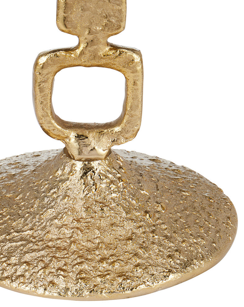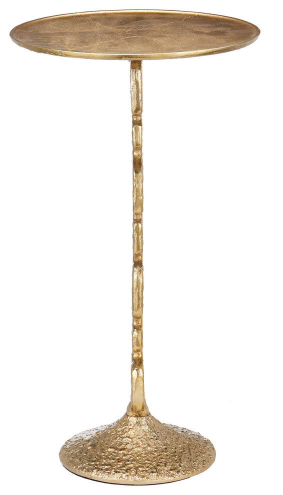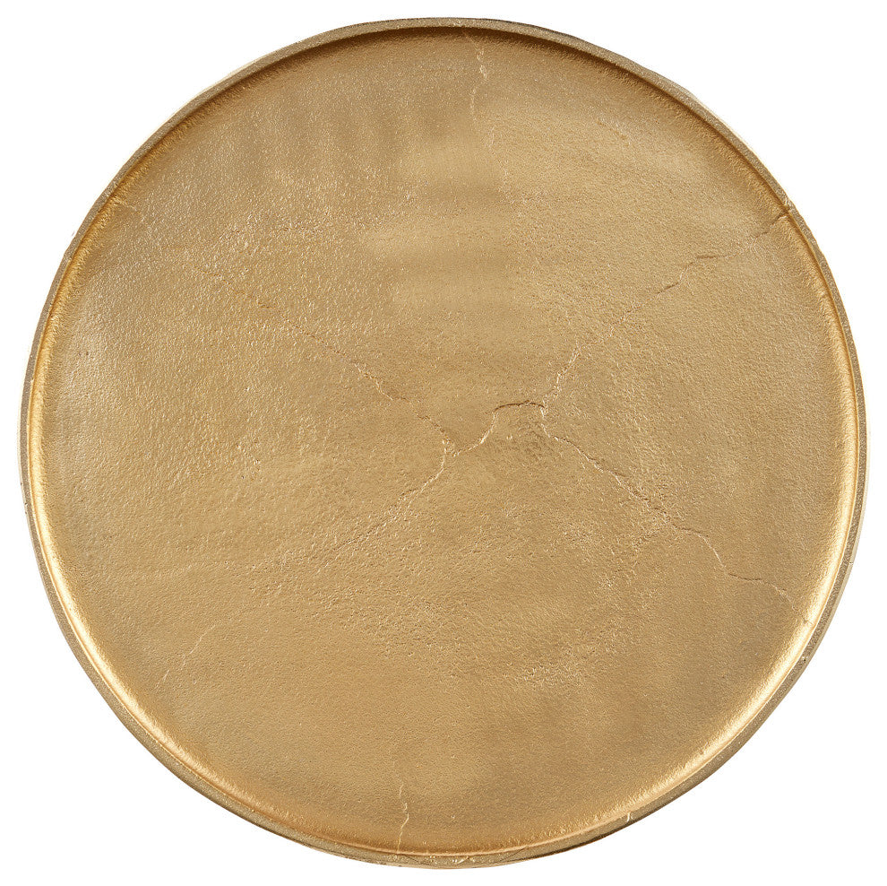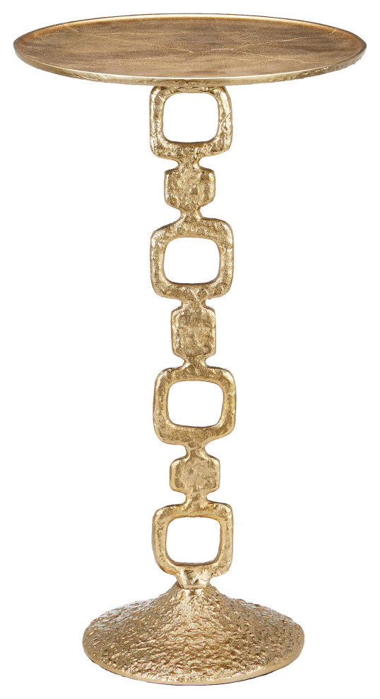 The Jussi Drinks Table is quintessentially artisanal, as the cast aluminum piece was made using the complex process that makes the formation of castings so unique. Though this is a small gold drinks table, it is heavy. Design details include the brutalist texture and style in which the jewelry chain motif is presented.