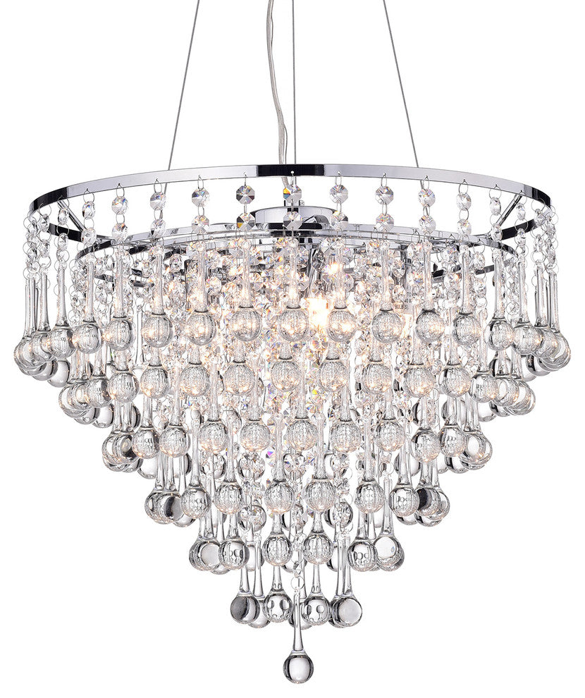 This exquisite chandelier couples dazzling crystals with a shiny chrome finish to create a stunning focal point in your favorite space. The five lights are surrounded by seven layers of elongated teardrop crystals that are each capped with a gentle sphere in a symmetrical cascade The chrome hardware and three adjustable metal chords measure at 40-inch making it ideal for multiple ceiling heights and room sizes.