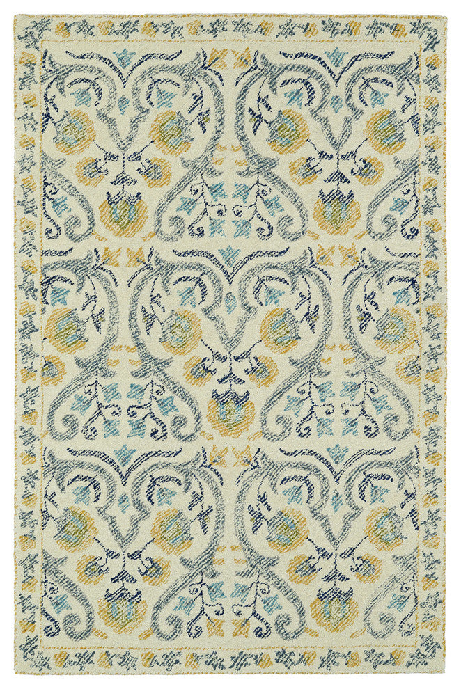 The Montage collection is a true collaboration of design inspiration from around the world. Uniquely constructed with a loop and cut pile for added texture, this collection offers a diverse selection of old world traditional, contemporary, and transitional patterns created for today�s evolving d�cor. Each rug is handmade in India of 100% wool. Detailed colors for this rug are Ivory, Gold, Denim Blue, Avocado, Turquoise, Navy, Gray.