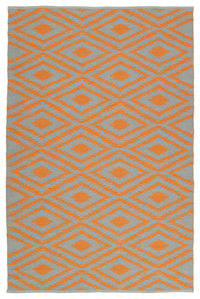 Grab your favorite drink, then kick back and relax with this exciting new Indoor/Outdoor flat-weave rug from our Brisa Collection. Completely transform your indoor and outdoor living space with this double-sided rug for years to come. All of these beautiful rugs feature two unique color options to choose from because of the innovative positive/negative color weaving technique. Each rug is handmade in India with 100% PET (recycled) Polyester. Detailed colors for this rug are Gray, Orange.