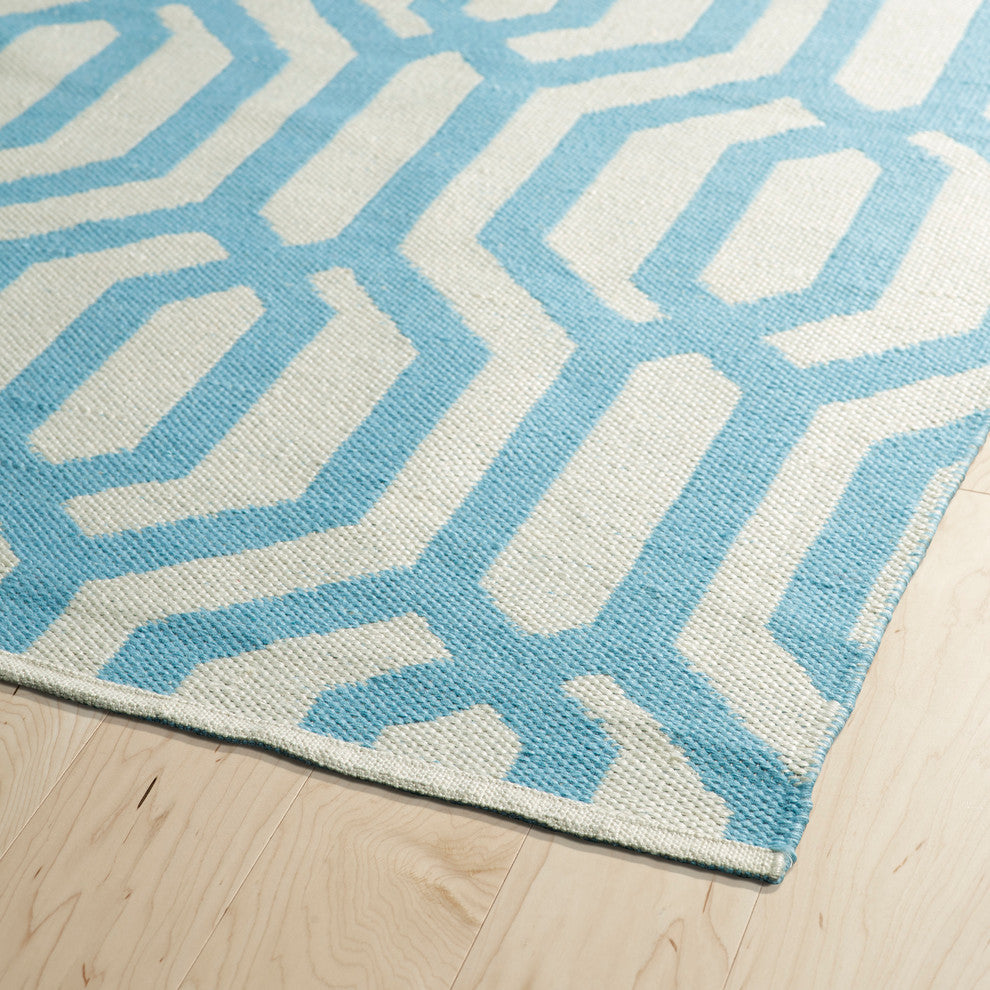 Grab your favorite drink, then kick back and relax with this exciting new Indoor/Outdoor flat-weave rug from our Brisa Collection. Completely transform your indoor and outdoor living space with this double-sided rug for years to come. All of these beautiful rugs feature two unique color options to choose from because of the innovative positive/negative color weaving technique. Each rug is handmade in India with 100% PET (recycled) Polyester. Detailed colors for this rug are Ivory, Spa Blue.