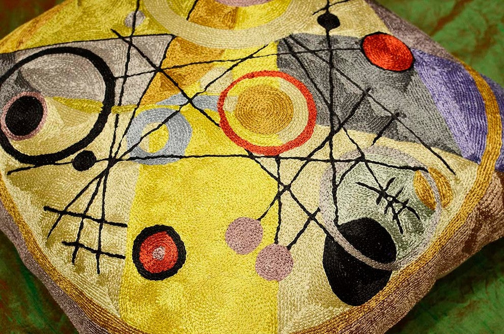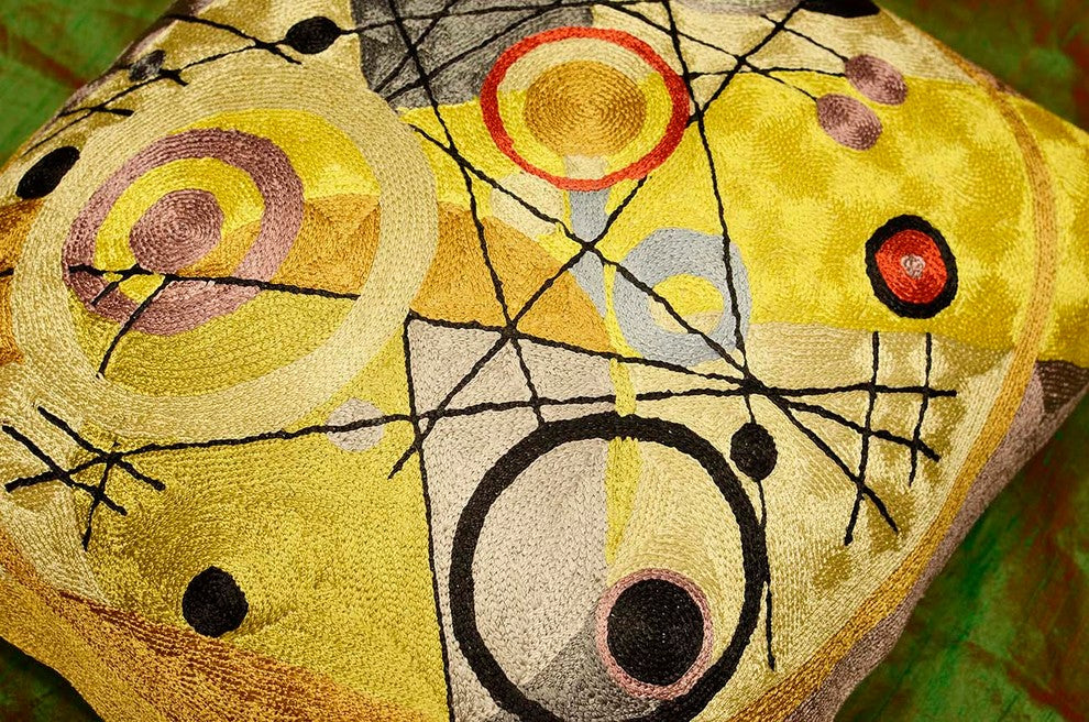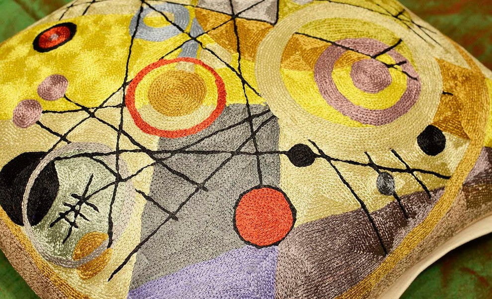 Modern Artist Wassily Kandinsky used the form of concentric circles to portray the soul. In this abstract throw pillow cover geometric forms and subtle color harmonies combine to make an effervescent, abstract composition.For Kandinsky, the circle, the most elementary of forms, had symbolic, cosmic significance. Rendered here as chain stitch embroidery modern toss pillow in art silk, this cushion cover can create a new personality for any room in which you choose to use it.This throw pillow cover has beautiful blend of red, blue, green,gold, pink and orange colors used to create distinct abstract forms.Composition: 70% Art Silk, 30% CottonSize: 18" x 18" (45 cms x 45 cms)Pillow Insert not IncludedSwirls of colorful chain stitch embroidery hand woven from soft Kashmiri Art Silk adds a dazzling sheen to the creation. In the abstract style of Wassily Kandinsky the eye-popping color and pattern of this creation is just what the designer ordered to create a fiery focal point in your décor. This accent pillow cover has beautiful color combination of orange, red, green and brown colors uniquely hand embroidered into various abstract forms and elementsThese modern pillow covers are handcrafted by Kashmiri artisans, and are of the finest chain-stitch embroidery in the world.Created of soft Kashmir wool over cotton, this all-natural cover makes an enduring impression. A close-up view of this abstract pillow cover allows you to see the amazing chain-stitch embroidery work of master artisans who have practiced this art their entire lives.This abstract decorative pillow cover could grace the cabin of your boat or the chair in your solarium and yet be equally as comfortable in your den.The eye-popping color and pattern of this modern throw pillow is just what the designer ordered to create a fiery focal point in your décor. Perfect wherever you need a splash of color, this art work pillow creation is as durable as it is beautiful. Easy to care for, this cushion cover could spark up an old throw pillow or grace a new pillow form.Kandinsky conveyed profound spirituality and inner human emotion through a visual language of abstract forms and colors that transcended cultural and physical boundaries. He used interrelation between color and form to create an aesthetic experience that engaged the sight, sound, and emotions of the viewer.Kandinsky viewed music as the most transcendent form of non-objective art "“ musicians could evoke images in listeners"™ minds merely with sounds. He crafted spiritually rich paintings that alluded to sounds and emotions through sensations. Modern Artist Wassily Kandinsky used the form of concentric circles to portray the soul. Rendered here as chain stitch embroidery in art silk, this cushion cover can create a new personality for any room in which you choose to use it.
