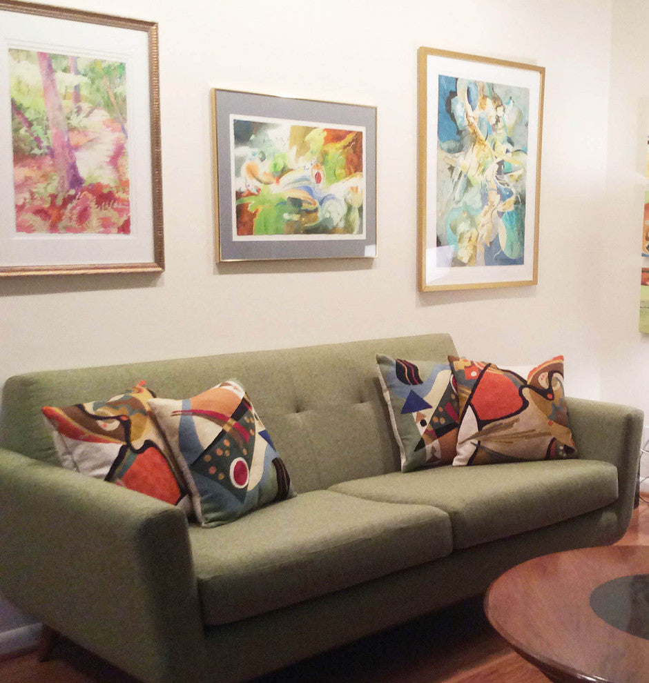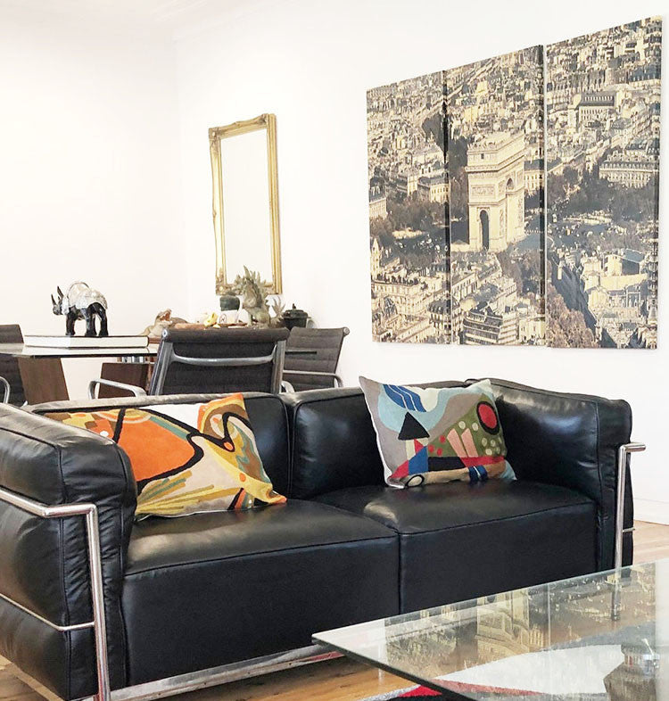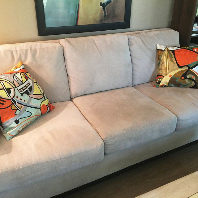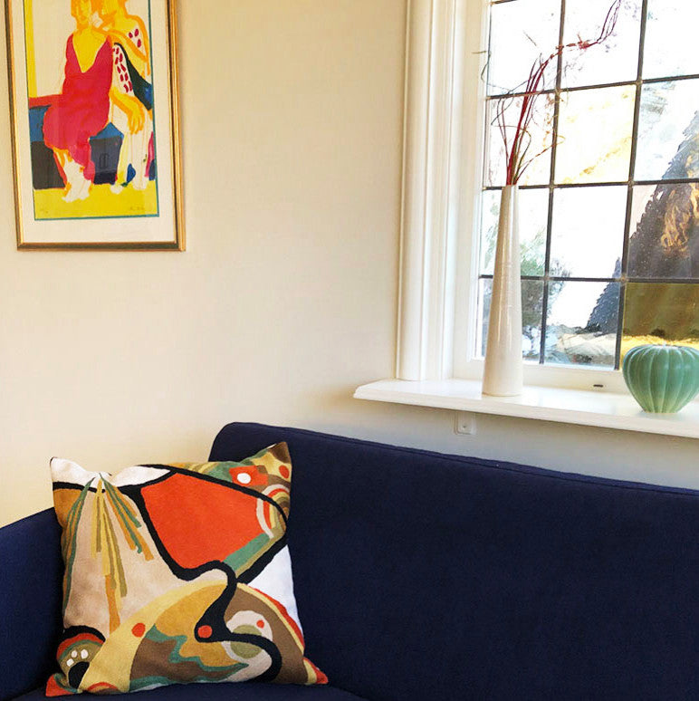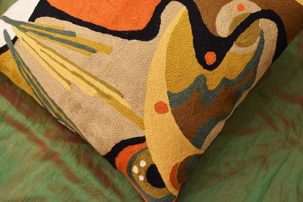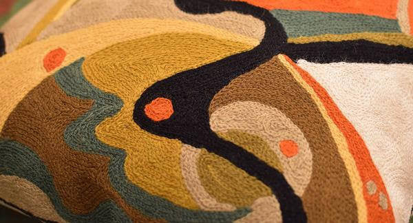 Kandinsky pillow cover "“ In the flow- Star fragments and enigmatic hieroglyphs artfully stitched in the finest Kashmir wool chainstitch needlework. Cosmic colors like blue, lavender and silver complement earthier tones of terra cotta, harvest green and amber to recreate a design based on the work of influential Russian artist, Wassily Kandinsky.The exciting pattern evokes the thought of a ladder to the stars, a comet"™s tail,or a star map. This cover could grace the cabin of your boat or the chair in your solarium and yet be equally as comfortable in your den. Durable and easy to clean, this toss pillow will catch the eye of every passerby.Composition: 70% Soft Wool, 30% CottonSize: 18"² x 18"² (45cm x 45cm)Pillow Insert not IncludedSwirls of colorful chain stitch embroidery hand woven from soft Kashmiri Art Silk adds a dazzling sheen to the creation. In the abstract style of Wassily Kandinsky the eye-popping color and pattern of this creation is just what the designer ordered to create a fiery focal point in your décor. This accent pillow cover has beautiful color combination of orange, red, green and brown colors uniquely hand embroidered into various abstract forms and elementsThese modern pillow covers are handcrafted by Kashmiri artisans, and are of the finest chain-stitch embroidery in the world.Created of soft Kashmir wool over cotton, this all-natural cover makes an enduring impression. A close-up view of this abstract pillow cover allows you to see the amazing chain-stitch embroidery work of master artisans who have practiced this art their entire lives.This abstract decorative pillow cover could grace the cabin of your boat or the chair in your solarium and yet be equally as comfortable in your den. The eye-popping color and pattern of this modern throw pillow is just what the designer ordered to create a fiery focal point in your décor. Perfect wherever you need a splash of color, this art work pillow creation is as durable as it is beautiful. Easy to care for, this cushion cover could spark up an old throw pillow or grace a new pillow form.Kandinsky conveyed profound spirituality and inner human emotion through a visual language of abstract forms and colors that transcended cultural and physical boundaries. He used interrelation between color and form to create an aesthetic experience that engaged the sight, sound, and emotions of the viewer.Kandinsky viewed music as the most transcendent form of non-objective art "“ musicians could evoke images in listeners"™ minds merely with sounds. He crafted spiritually rich paintings that alluded to sounds and emotions through sensations. Modern Artist Wassily Kandinsky used the form of concentric circles to portray the soul. Rendered here as chain stitch embroidery in art silk, this cushion cover can create a new personality for any room in which you choose to use it.