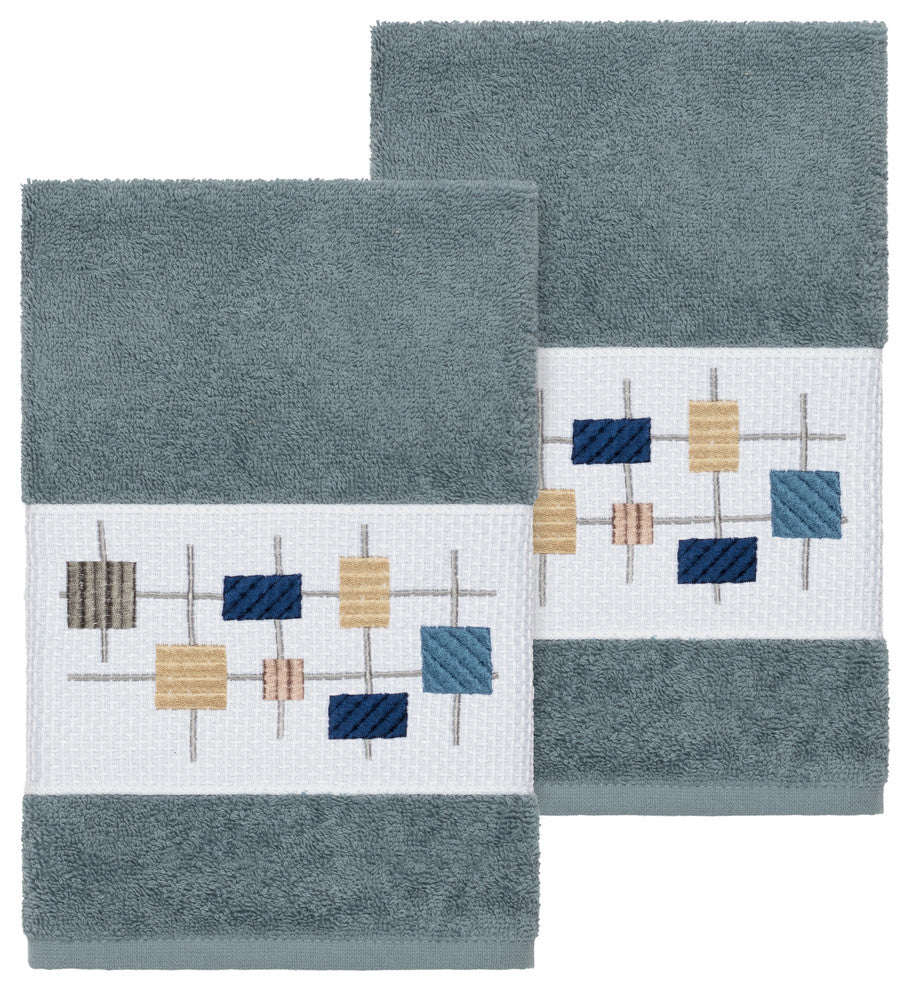 The KHLOE Embellished Towel Collection features a mod geometric grid embroidery on a woven textured border.These soft and luxurious towels are made of 100% premium Turkish Cotton and offer lasting absorbency and superior durability. These lavish Turkish towels are produced in Linum�s state-of-the-art vertically integrated green factory in Turkey, which runs on 100% solar energy.Set includes 2 Hand Towels (16" x 30") 100% Premium Turkish Cotton. Superbly absorbent and quick drying. Machine wash cold, No bleach, line dry or dry clean. Toweling manufactured in Turkey using "100% Solar energy". Embellished in USA. 3-5 business days required for shipping.