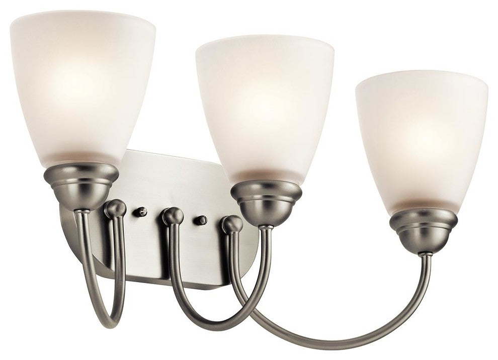 Three Light Bath from Jolie collection in Brushed Nickel finish. Number of Bulbs 3. Max Wattage 100.00. No bulbs included. Enjoy the splendor of this Brushed Nickel 3 light bath light from the refreshing Jolie Collection. The clean lines are beautifully accented by satin etched glass. Jolie is the perfect transitional style for a variety of homes. No UL Availability at this time.