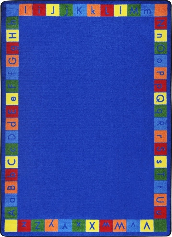 This carpet consists of an open field of blue bordered by multi-colored blocks containing the upper and lower case letters of the alphabet. Because the design is simple, it will fit perfectly under a table and chairs or in front of a bookshelf.