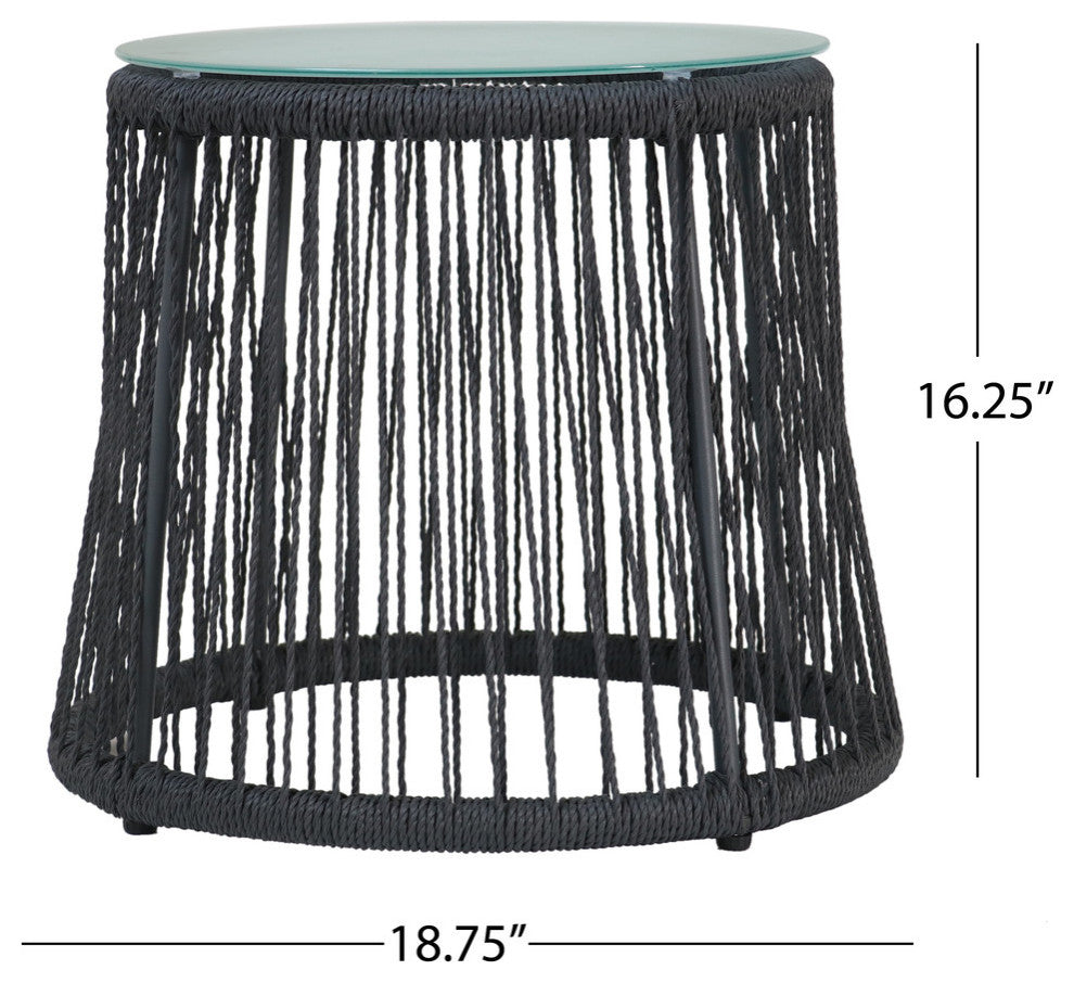 CHIC AND BOHO - The natural texture of the rope siding contrasts boldly with this piece''s sleek tempered glass top; it''s supported by a robust iron frame.