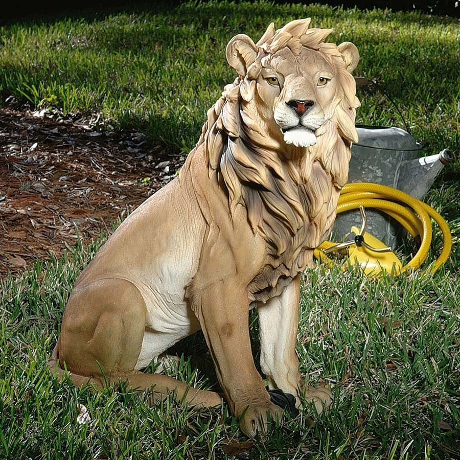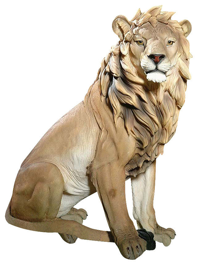 Our regal lion statue with wind-blown mane will proclaim that your home is truly your castle! The artist has sculpted the animal king at over two feet high from his serene gaze to oversized paws, then cast him in quality designer resin and hand-painted him with realism. Whether you admire this statement piece for his natural beauty or his stately bearing, our Design Toscano-exclusive King of Beasts animal statue will lend a crowning touch to home or garden. 13.5"Wx21"Dx27"H. 15 lbs.