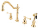 Victorian style Two Handle Deck Mount, 4 hole Sink application, 8" Widespread, Solid Brass Side Spray, Fabricated from solid brass material for durability and reliability, Premium color finish resist tarnishing and corrosion, 360 degree turn swivel spout, 1/4 turn On/Off water control mechanism, 1/2" - 14 NPS male threaded inlets, Duraseal washerless valve, 1.8 GPM / 6.8 LPM Max at 60 PSI, Integrated removable aerator, 8-1/4" spout reach from faucet body, 9-1/4" overall height, Ten Year Limited Warranty to the original consumer to be free from defects in material and finish.Sprayer Not Included1/4 Turn Washerless CartridgeBuckingham Lever HandlePVD polished Brass Finish3 Holes Installation with an 8-1/4" spout reachMax 1.8 GPM/6.8 LPM Water Flow Rate At 60 PSI (ASME standard)Compliant with California Energy Commission Title 20
