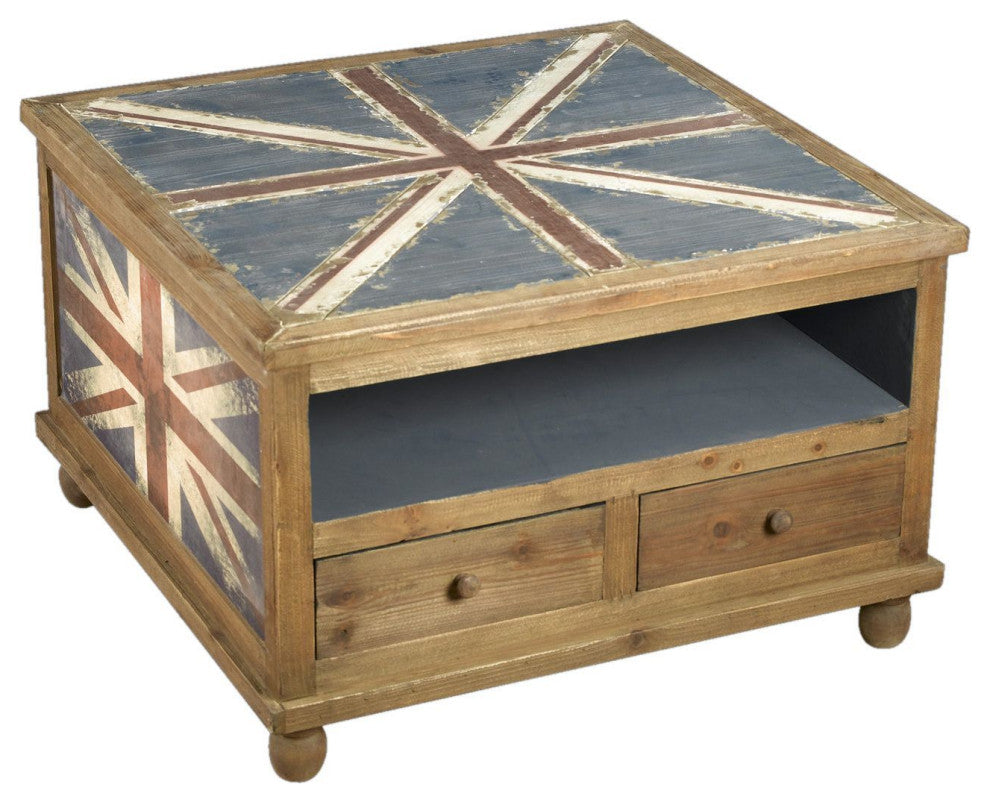 Accent your living rooms with the Kinzie Coffee Table. Sporting an eclectic appearance with its United Kingdom flag table top, it gives off a playful aesthetic perfect for that whimsical look. It has a distressed finish that is also reminiscent of rustic and farmhouse aesthetics.Features:•  Overall product dimensions are 34" W x 32" D x 21" H•  United Kingdom flag design for the table top•  Rustic, distressed look•  Bears eclectic and farmhouse aesthetics•  Low-maintenance and easy to cleanDimensions:Standard Coffee Table•  Assembled Product: 34 inches wide x 32 inches deep x 21 inches high•  Weight Capacity: 150 pounds