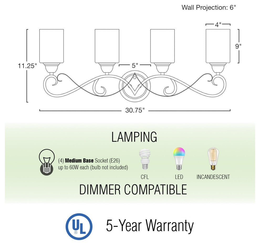 • [TRADTIONAL DESIGN] The classic 4-light vanity light showcases a traditional design, featuring a gorgeous oil rubbed bronze finish that instantly upgrade your bathroom or powder room. This bathroom light''s curved vine style arms and ombre tinted cylinder glass shades emit a bright glow, making it a prime choice among interior designers and builders for both new construction and remodel projects• [EASY INSTALLATION] Versatile for full or half bathrooms, powder rooms over sinks, or above vanity mirrors. This oil rubbed bronze wall light is popular in residential spaces including custom homes and modern apartments, and can be mounted upwards or downwards for easy customization. It''s cylinder tinted glass shades bring a sleek and stunning appeal to any new construction or remodel project• [UL LISTED FOR YOUR SAFETY] UL listed for damp locations. Uses (4) LED, CFL or up to 60W traditional incandescent medium base bulbs. Bulbs sold separately. Dimmer compatible. Includes all hardware for quick installation of this traditional linear vanity light• [DIMENSIONS] 11.25" (H) x 30.75" (L) x 6" Wall Projection, Shades: 5.5" (H) x 4" (D), Backplate: 4" (D)• [FITS MANY DECOR STYLES WITH UNMATCHED WARRANTY] This traditional bathroom light fixture with classy oil rubbed bronze finish complements all decor styles from rustic and traditional, to chic and modern designs. Enjoy peace of mind with our 5-year warranty, guaranteeing your complete satisfactionThe Villa Vanity Light easily incorporates a touch of class to any bathroom or powder room. Complete your traditional decor with this glamorous addition that is sure to enhance the design in your vanity room. The amber glass shades create a warm light yet still provide plenty of light and the decorative scrolls along the metal frame accentuate the bath bars design. The Villa proves that you don''t have to sacrifice great style when you''re remodeling your bathroom all within a budget.• Collection: Villa• Height: 11.75"• Width: 6"• Depth: 30.75"• Finish: Oil-rubbed Bronze• Material: Metal• Shade: AmberBase Type: E26Includes: Mounting HardwareIndoor/Outdoor Usage: IndoorLighting Direction: Up/Down LightLighting Source Type: Incandescent, LED, CFLMounting Style: WallSafety Rating: UL ListedLocation Rating: DampShade Shape: CylinderShade Material: GlassFinish Type: PaintedRecommended Room Type: Indoor, Home, Living Room, Bathroom, Foyer, Stairs, Kitchen, Den, Bedroom, Dining Room, Entry, HallSpecial Feature: Dimmer Compatible