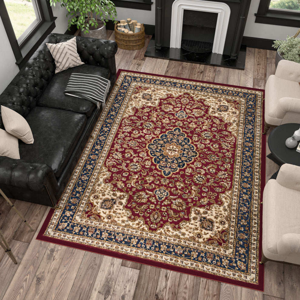 Blanket your floors in the traditional beauty of the Kirsten Traditional Oriental Area Rug. This stunning rug features an intricate medallion pattern in vibrant red, navy blue and ivory. Polypropylene fibers make this rug easy to care for and naturally stain-resistant, perfect for high traffic areas, large kitchens or even under the family dining table.10''6"x14''6"rugCare instructions: Vacuum and spot cleanColor: RedMaterials: Power loom machine-made polypropyleneDimensions: 10''6" W x 14''6" DPlease Note: Due to differences in computer monitors, some product colors may vary slightly.