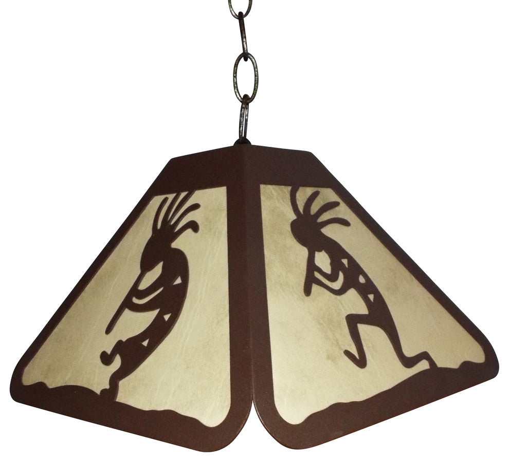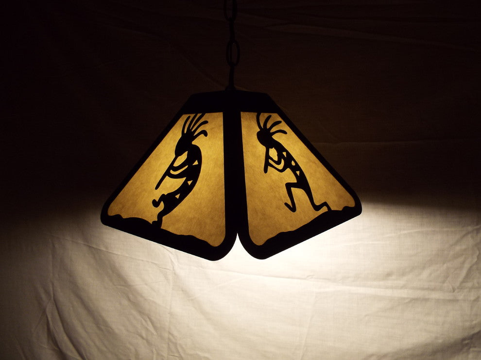 Steel Pendant lamp with 6'' cord, 3'' of chain and pull chain switch. 2 kokopelli designs alternate on four sides.