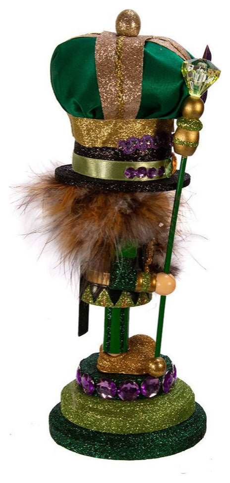 Designed by renowned artist Holly Adler, Hollywood Nutcrackers is a whimsical collection of nutcrackers created exclusively for Kurt Adler. This 12-Inch Hollywood Mardi Gras Nutcracker features green, purple, and gold glitter and gem detailing. His festive hat features the Fleur De Lis! This nutcracker is a stunning addition to any holiday decor.