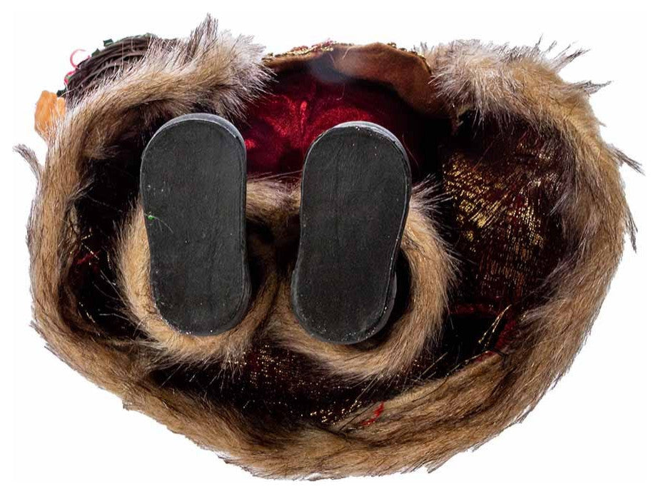 This 17-inch Kringle Klaus Wine Santa from Kurt Adler is a fun and festive addition to any holiday decor. Part of the Kringle Klaus collection, this Santa Claus is wearing a burgundy robe with tan fur trim a gold brocade vest with red gemstones, a matching Santa hat with grape accents and red pants. In one hand he is holding a bottle of "Merlot" and in the other he holds a basket of red and white with a bunch of grapes.
