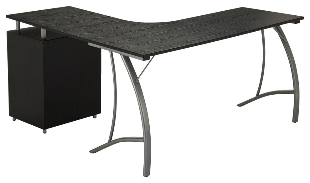 This modern Techni Mobili L-Shaped Computer Desk features a spacious desktop in a curved boomerang shape with an attached locking storage and file cabinet. Curved legs are made of scratch-resistant powder-coated steel, while desktop and storage cabinet are made of heavy-duty engineered wood panels with PVC laminate surface. The desk sides are interchangeable. Available in Espresso.