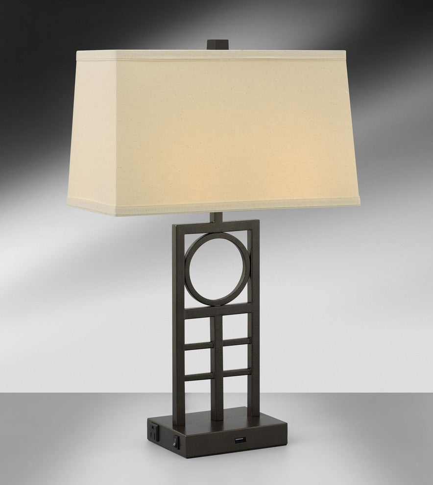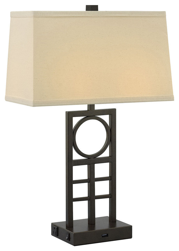 Standard Lamp Specifications for #UHB222:Product Type: Desk LampHeight: 26"Finish: Hammertone BronzeConstruction: SteelSocket: (2) Ceramic On/Off Med. Base Type A 60W Max socket(s). (Bulb not included)Switching: (2) On/Off Rocker switch(es) located on the base.Cord: 8'' (from base) long black 16 gauge cord set with a 3 prong grounded plug.Electrical Outlet: (2) 3 prong grounded outlet(s).Data Port: None.USB Port: (1) 10W/2A USB port(s).UL/CUL and/or ETL listed: YesHarp Pipe Size: 6 inches (bead-to-bead)Standard Packing: 2 per carton (shade packed separately).Lamps & Shades per SKU: 1Lamping: (2) Ceramic On/Off Med. Base Type A 60W Max socket(s).Shade Size and Description: Off-white fabric laminated to rectangular styrene hardback drum with self fold trim measuring 7"/15" x 9"/16" x 9.5" w/ .5" drop w/flatted washer (Top x Bottom x Slant).Bulb Included: NoMaterial Description: constructed from polished, plated, and lacquered steel.