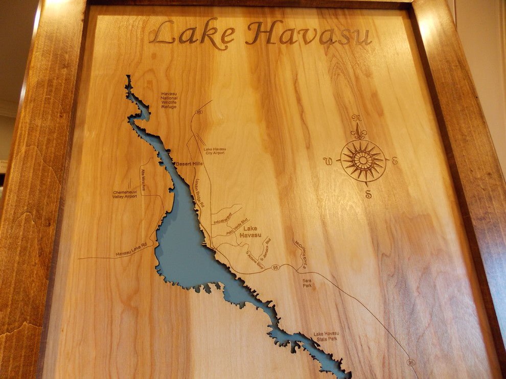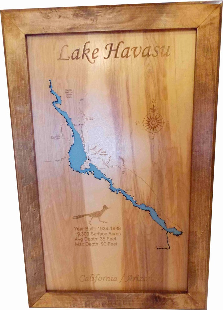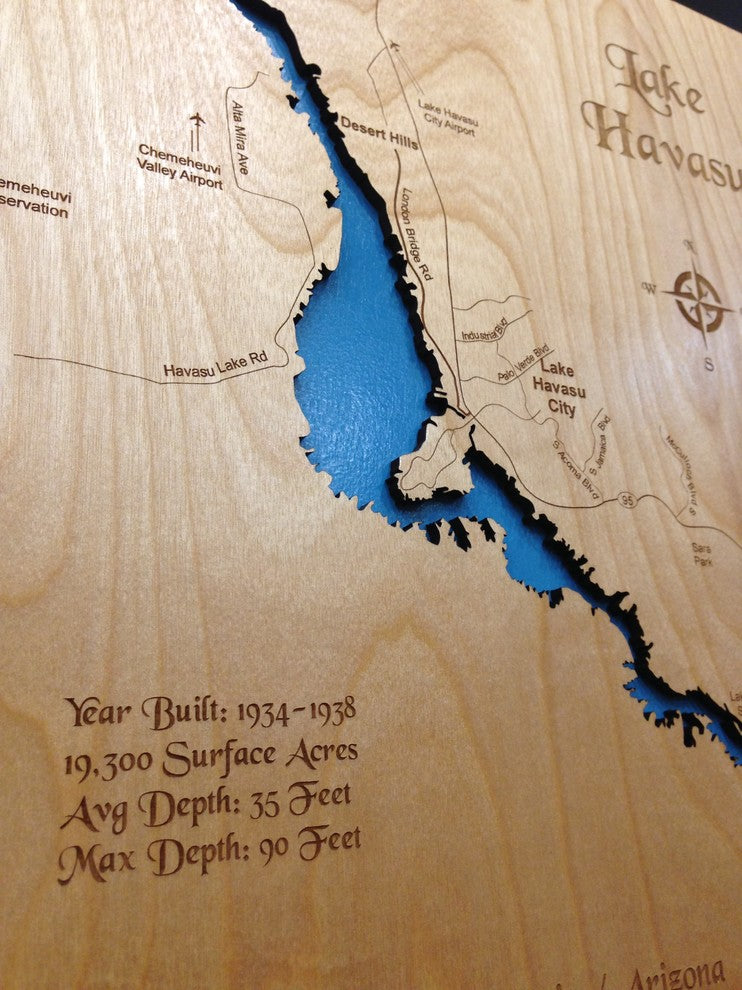 This is a beautifully detailed, laser engraved and precision cut topographical Map of Lake Havasu bordering California and Arizona with the following interesting stats carved into it: