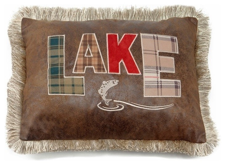 Make a southwestern-inspired statement on a bed, sofa or bench in your home with the Lake Pillow from Carsten. Made with faux leather fabric, this pillow boasts the word "lake" in various plaid patterns and has an embroidered fish at the bottom that adds fun interest.