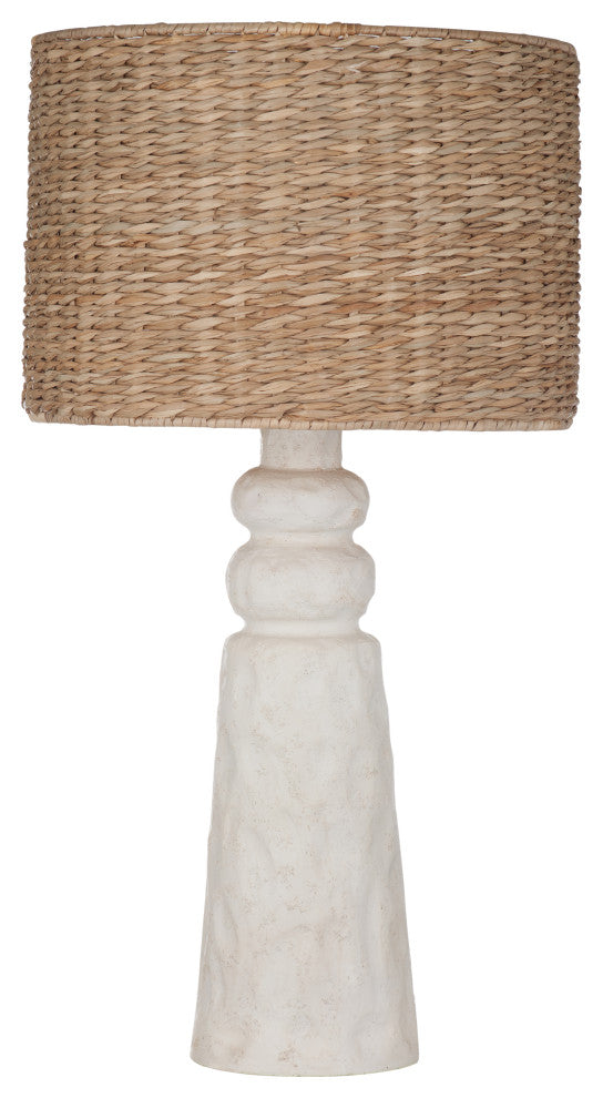 The Laramie Table Lamp captures the essence of coastal style with its resin lamp body, which is sculpted to resemble carved wood, evoking a sense of beachside driftwood. The body''s distressed white finish contributes to its laid-back, seaside charm. This casual aesthetic is complemented by a natural, woven lampshade, which adds an organic texture and casts a warm, ambient light reminiscent of a sunlit shore. Perfect for creating a relaxed and inviting atmosphere, this lamp pairs well with light, breezy interior designs.
