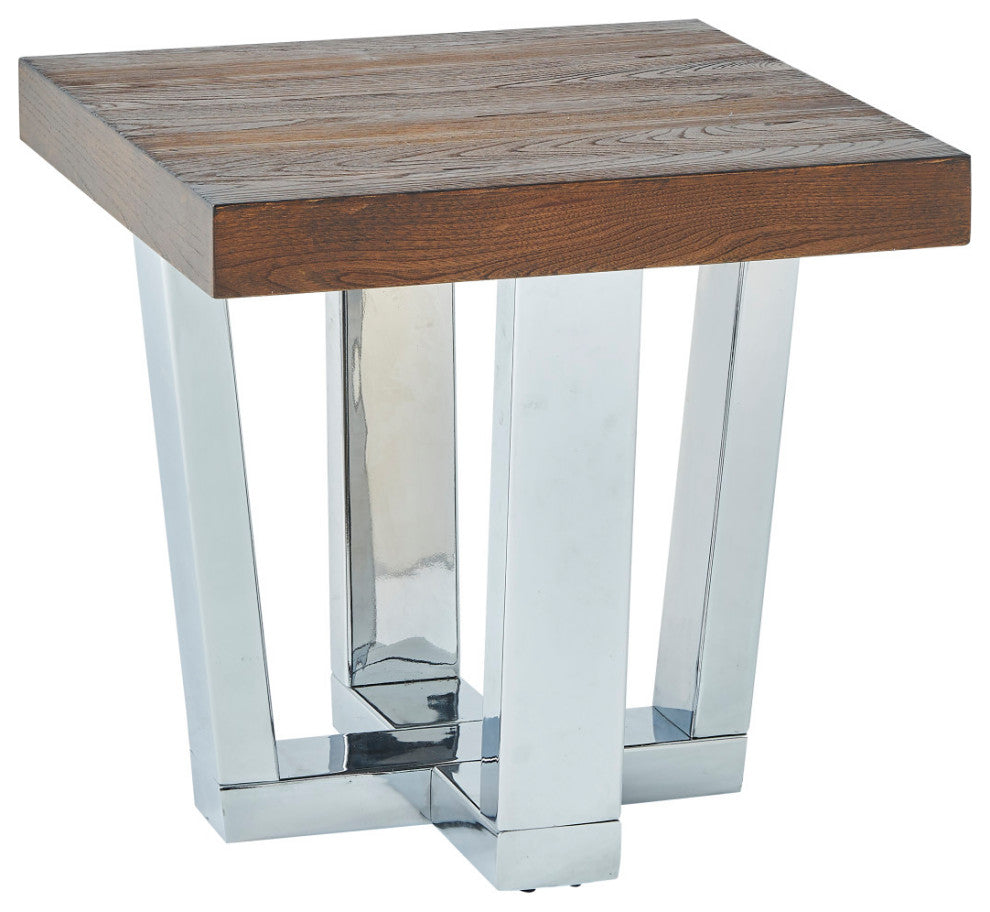 A rustic modern take on the treditional Side Table. Whether in a living room or bedroom, the Laredo brings a casual elegance to any setting. A hand-stained Chestnut finish balances the sparkle from the chrome finished base in a mixed media package with both character and style.