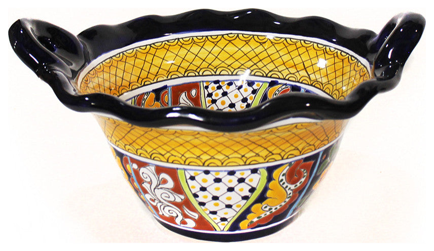This large beautiful handpainted bowl with two handles is a great center piece for any table. It makes a great fruit bowl or perfect display piece. As with all our other talavera, this bowlis lead-free.