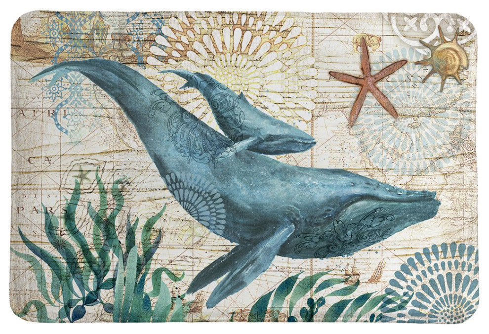 A mother whale and her baby calf drift calmly through the sea in our "Bay Whale" memory foam rug. Concentric circle designs in various cool colors contribute to the feeling of peace throughout the piece. An old-fashioned ivory map of the ocean provides the perfect background to the blues and greens of the sea life that take center stage on this whale bath mat. Take a quick trip to the sea every time you step into your bathroom. Artwork by Geoff Allen, presented by Laural Home. All of our products are digitally printed to create crisp, vibrant colors and images. Made to order in the USA on imported fabric.Measures 21" x 34"High quality for ultra soft comfort100% polyester topMachine washableNon-skid backing