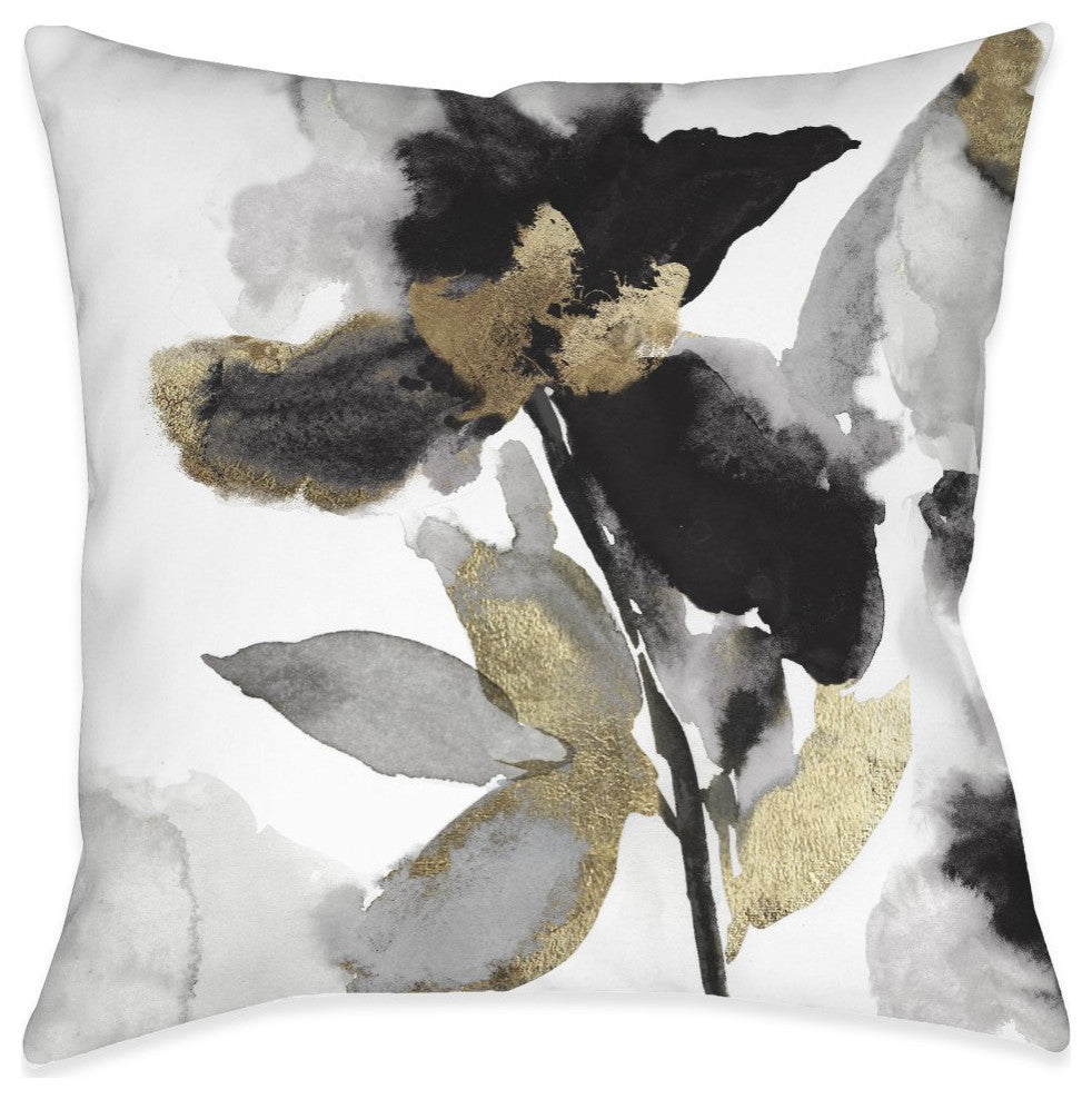 This abstract floral Inspired indoor decorative pillow, "Black and Gold Petals" creates a modern look to any home. The design features smoky gray and black leaves with gold accents against a white background for a simple and classic look. "Black and Gold Petals" will add a touch of elegance to your home!