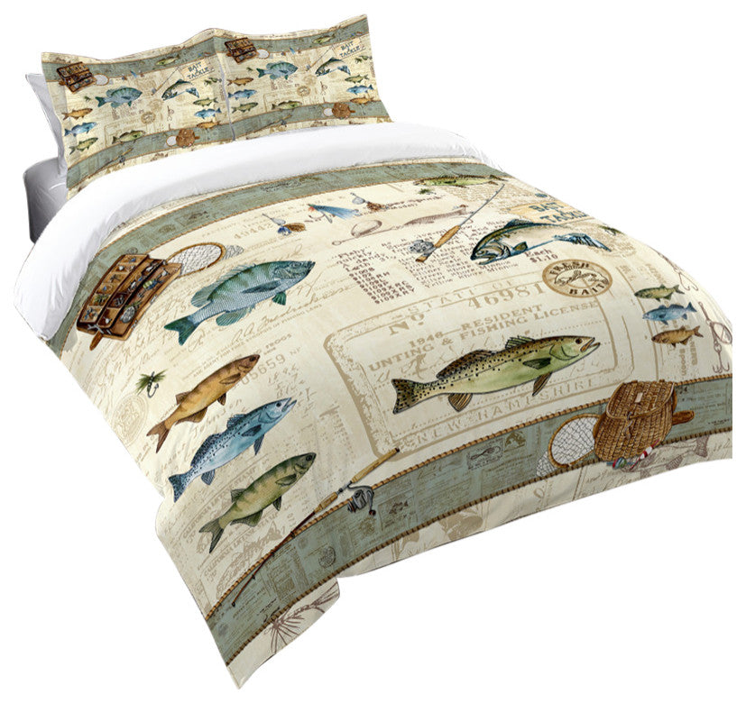 This lake inspired sham, "Catch Of The Day," is the ideal fisherman''s decor! Multicolored fish swim around the design with fishing equipment scattered amongst a text filled background. "Catch Of The Day" will definitely create a fishing trip experience every day! All of our products are digitally printed to create crisp, vibrant colors and images. Sham reverses to solid white color. Made to order in the USA with imported fabric. Printed brushed microfiber top with solid bright white back Square pattern stitching for a modern, clean look Machine washable Comforters and shams sold separately Comforter shams intended for comforters only Artist: Ta-Da Innovations
