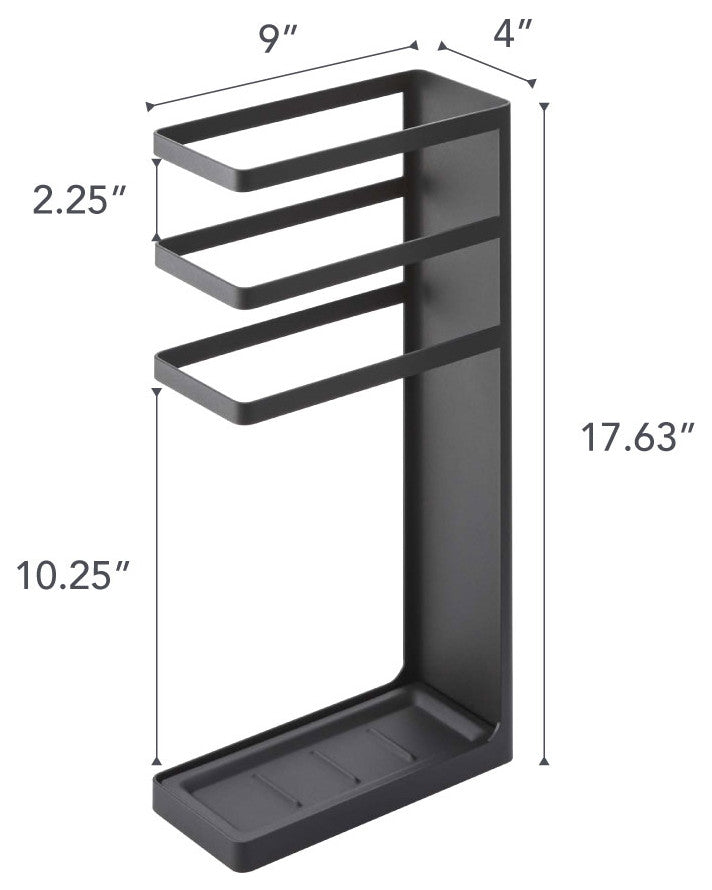 A modern and open-frame umbrella stand designed to save space. Ridges along the base tray keep umbrellas upright and in place and the slim design tucks easily into an entryway or closet.