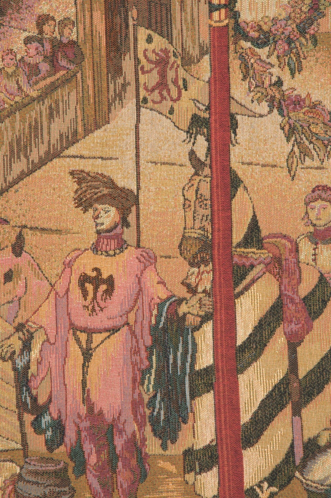 This jacquard wall hanging tapestry, Le Tournai, or The Tournament is a reproduction of an 1895 oil painting by Jean-Paul Laurens, titled; A Tournament Scene At the end of the 15th Century. A faithful interpretation of the original oil painting was woven at the Royal Manufacture of Gobelins from 1895 to 1899. Highly stylized, this epic composition can be compared with the sumptuous middle-ages frescoes.