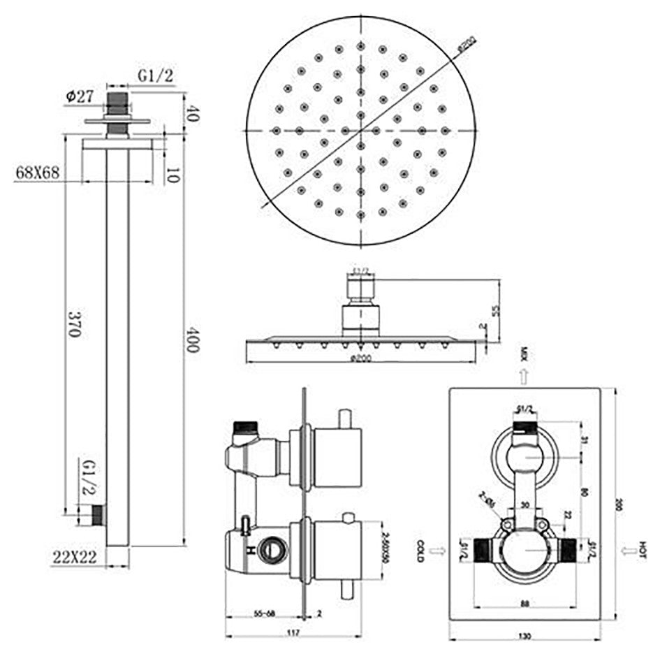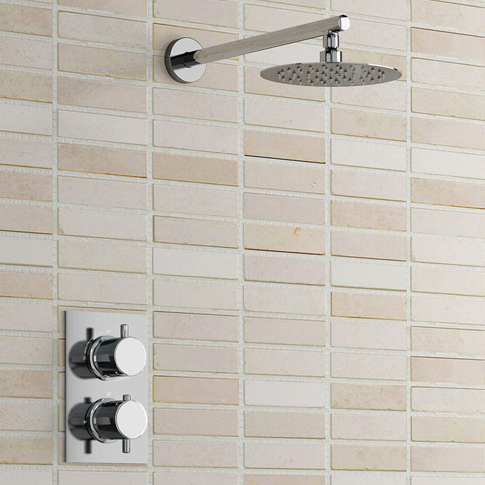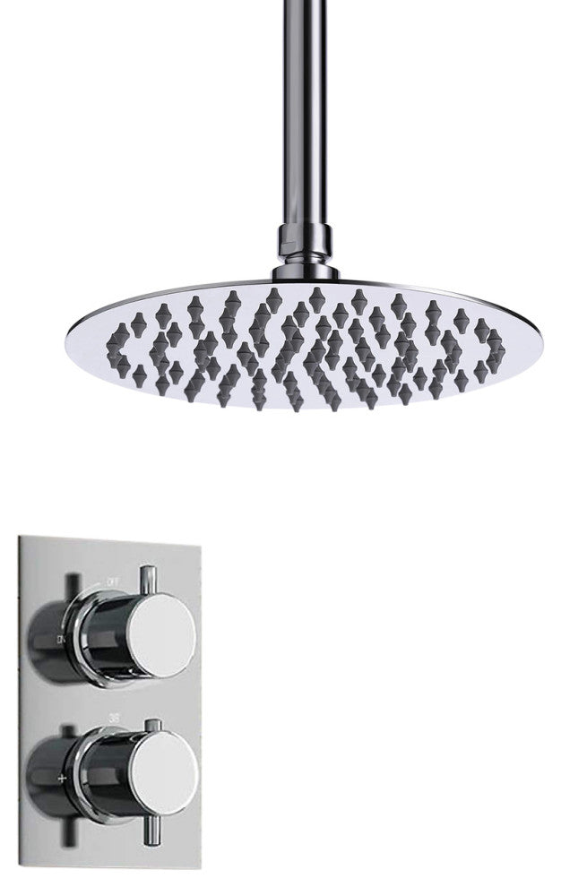 This concealed thermostatic mixer valve shower set is a perfect addition to any bathroom. The thermostatic mixer valve gives you complete temperature control with a built-in anti-scalding device, so you''ll never have to worry about a drop in temperature again. Chrome plated solid brass construction Built in anti scald device set to 38 Easy clean anti-limescale rubber jets Minimum wall depth of 3. 42" (87mm) required Minimum 1. 0 bar water pressureConcealed Thermostatic 2 Dial 1 Way ShowerLenox Ceiling Mount Shower Set DescriptionType : Shower SetStyle : ContemporaryNumber of Handles : Dual HandleType : Fixed Rotatable TypeSurface Finishing : ChromeFeature : Thermostatic MixerCold/Hot Water Control Type : Dual Holder Dual ControlSize : See OptionsSurface Treatment : PolishedValve Core Material : CeramicFlow Rate: Maximum 1.8 GPMAerator Included: Minimum .5 GPMInstallation Type : Wall MountedThermostatic Mixer Valve features : Laser printed dialsCrafted from solid brass so it won''t corrode or rustCartridges are resistant to limescale build upIncludes an anti-scalding device set at 38 degree CCan be fitted on both solid or stud wallMixer requires a wall cavity of 3. 42" (87mm)Working Requirements : Our thermostatic showers work on water systems that produce a minimum of 1. 0 bar water pressure. This can be achieved by using one of the following systems: Combination boiler systemsGravity fed systems (only with a pump)Megaflow systemPumped hot water systemsUn-vented hot water systemsStandard pressurized hot water cylinder type systems2 Dial 1 Way Thermostatic Mixer ValveTop Dial - on/offBottom Dial - temperature controlShower Head Features : Easy clean anti-limescale rubber jets12" Round Ultra Thin Stainless Steel shower headProvides an even spray and full water coverageSwivel joint allows you to adjust the angle of the sprayShower Arm Features : Arm is constructed from solid brass, so it won''t rust or corrodeWater tight fittingSturdy construction will hold heavy shower headsCeiling mounted arm is suitable for all plumbing systemsOur mixers are cast from one single piece of metal eliminating these weak spots. Did you know we use the latest technology in the manufacturing process?We mould our thermostatic mixers by Gravity Die Casting to ensure a stronger more durable mixer. We use CNC Machinery to cut all of the threads on our mixers to ensure 100% accuracy, creating a tighter fit which eliminates leaks. Other manufacturers cut costs by engraving their mixers by hand, these are more susceptible to leaks due to the inaccuracies of hand engraving. Did you know our thermostatic mixers are hand polished?Before we chrome our mixers they are hand polished to create a great smooth surface that makes it easier for the chrome to bond. Did you know we finish our thermostatic mixers in thick, high quality chrome?Our mixers have a highly reflective mirror finish that stays looking new for longer. We achieve this high quality finish by thickly chrome plating our mixers. You can test the quality of chrome by simply placing your finger on the chrome on poor chrome your finger will leave a mark on good chrome your finger print will disappear. Did you know our thermostatic mixers are double tested?Our mixers are tested twice during the manufacturing process. Our thermostatic mixers are air pressure tested before they are chrome plated, and water pressure tested before they are packaged,