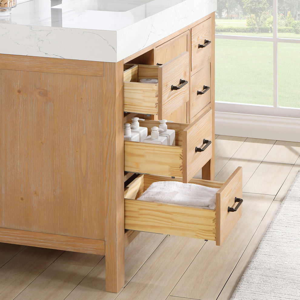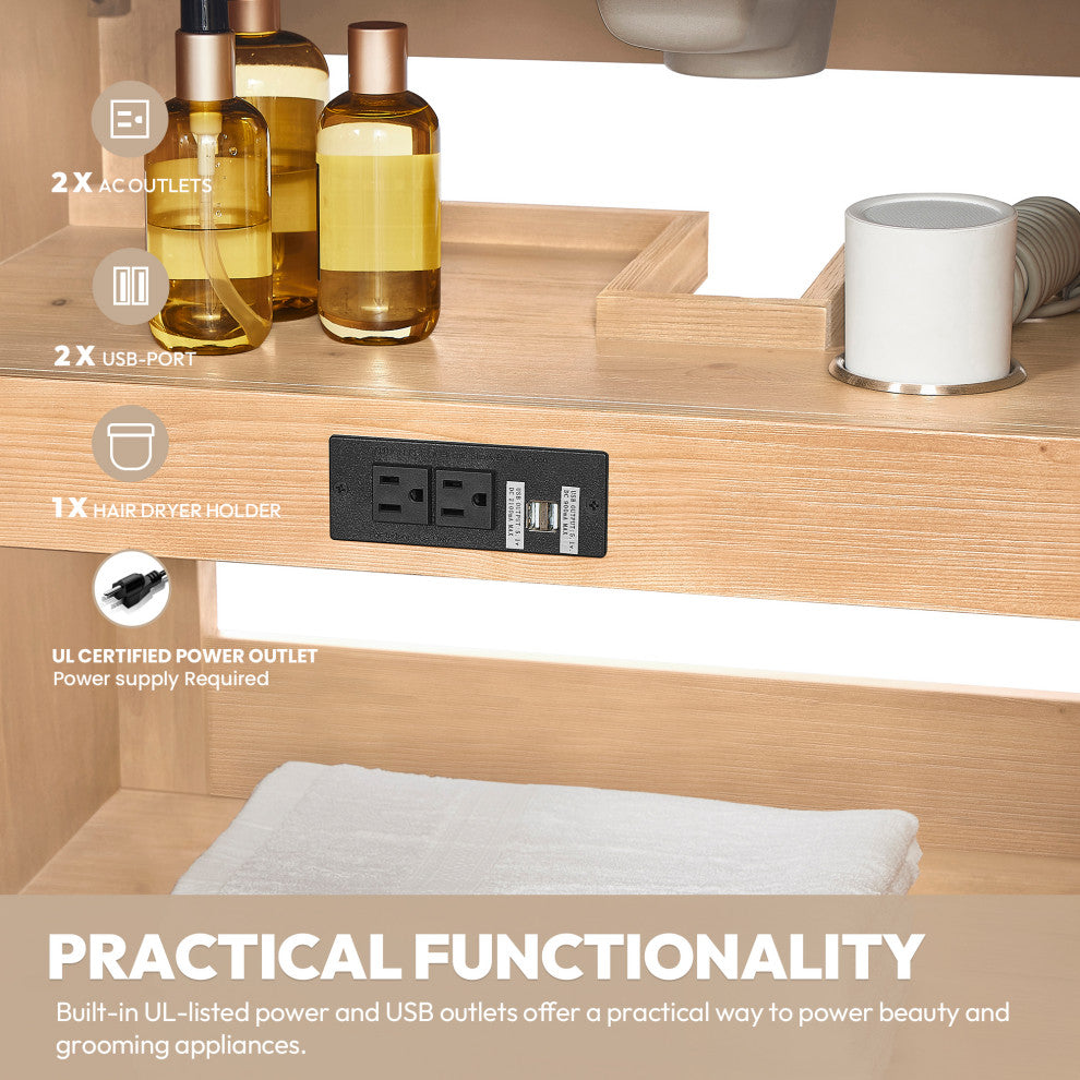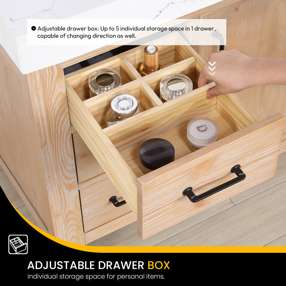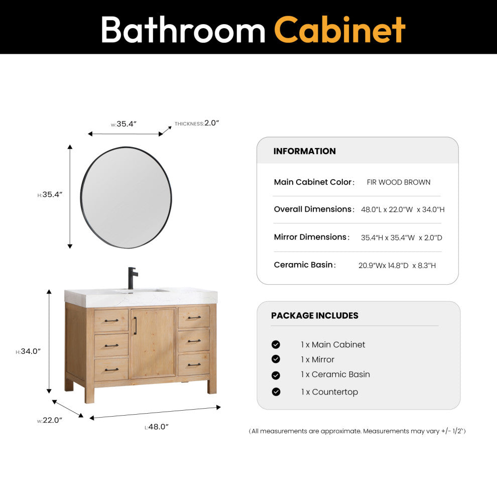 Featuring quality solid oak construction, the Leon Vanity combines the natural warmth of wood with sleek finishes like composite stone and metal hardware. This durable and stylish piece is functional as well, with generously sized cabinets and drawers that neatly house all your personal care items. Whether you''re remodeling your guest or master bath, or just looking to freshen up your space, the Leon is sure to impress.Features Constructed of imported solid oak wood and plywood for superior durability and long-lasting beauty.Available in your choice of a beautiful Fir Wood Brown, Fir Wood White, or Fir Wood Grey finish to complement your decor. One soft-closing door and six sturdy, soft-closing dovetail drawers offer ample space for all your toiletries. Adjustable wooden drawer inserts allow you to keep toiletries and other items neatly organized.Brushed Gold or Matte Black hardware adds a cool touch of style and contrast against the textured wood.3.9"-thick, Lightning White or Reticulated Grey composite stone top lends a fresh and contemporary look, featuring 45-degree chamfered water retaining edges all around without backsplash.Bright white ceramic undermount sink with overflow blends seamlessly with the stone vanity top.Built-in UL-listed power and USB outlets offer a practical way to power beauty and grooming appliances.Includes convenient hair dryer organizer that keeps your favorite tool within easy reach.Single, circular, aluminum-framed mirror complements the vanity and ties it all together. (Mirror Option)Countertop has a pre-drilled, standard 1-3/8" faucet hole.High-quality hardware adds a touch of classic style and stunning contrast against the textured wood.Designed for easy, no-hassle plumbing and faucet installation.Freestanding bathroom vanity (without back panel) comes fully assembled for your convenience.1-Year Manufacturer Warranty purchase with 100% peace of mind. • Does not include faucet, drain assembly, backsplash, or P-trap,Storage Cabinet. Comes fully assembled and ready to install in your bathroom.Vanity Dimensions:Item: #703848-FN/703848-FW/703848-FYCabinet: 47.6"W x 21.8"D x 33.3"HTop: 48"W x 22"D x 3.9"HOverall Dimensions: 48"W x 22"D x 34"HBasin Depth: 8.3"All specifications are subject to change without prior notice.