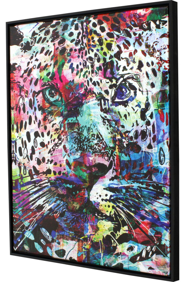 A kaleidoscope of vibrant color gives a jungle predator a contemporary vibe. Leopard canvas is mounted in a flat black floater frame.