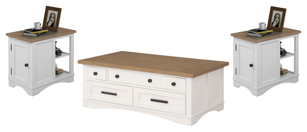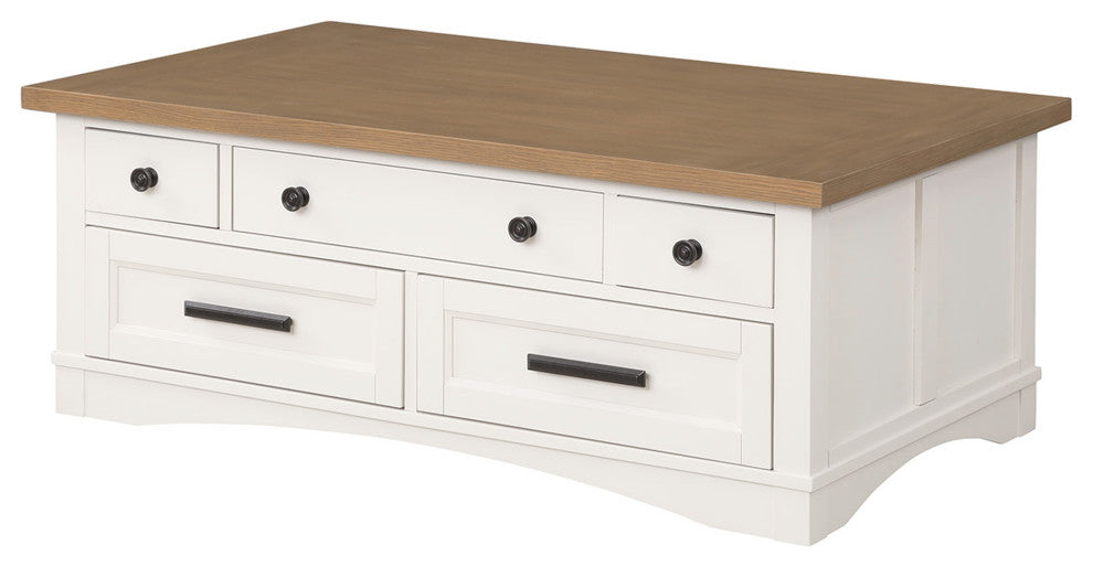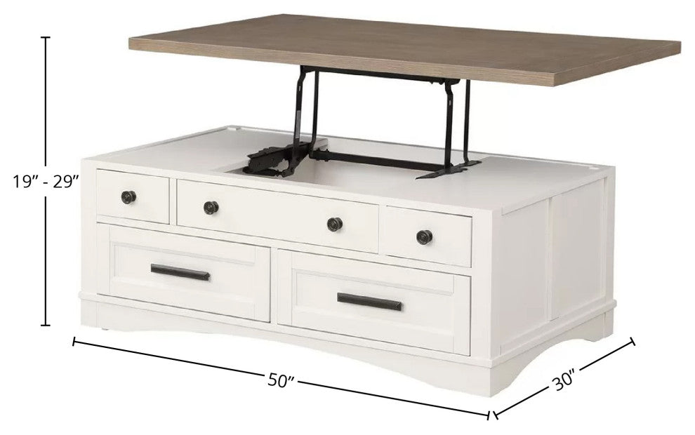 Add style and functionality to your seating area with this innovative Cocktail Table with Lift Top from the Americana Modern Collection. The innovative lift top opens and extends to create a flexible surface for working or eating. Its clean lines and vintage-inspired styling are finished in a crisp white painted Cotton finish accented with a contrasting wood-tone top in Weathered Natural. Multiple storage drawers offer a place for everything and make it easy to contain clutter.Features: