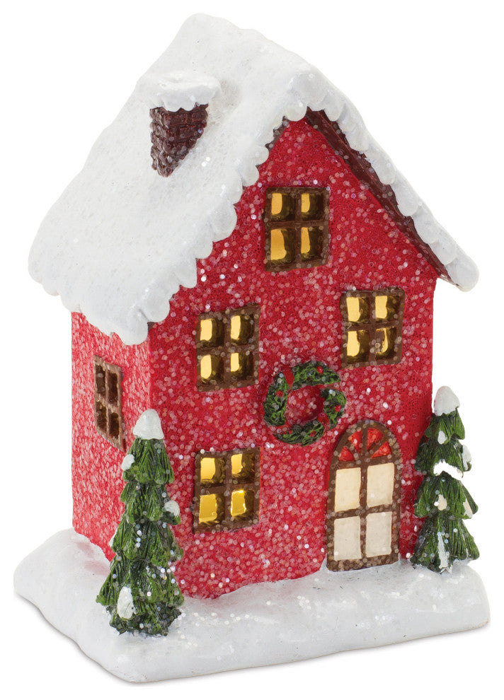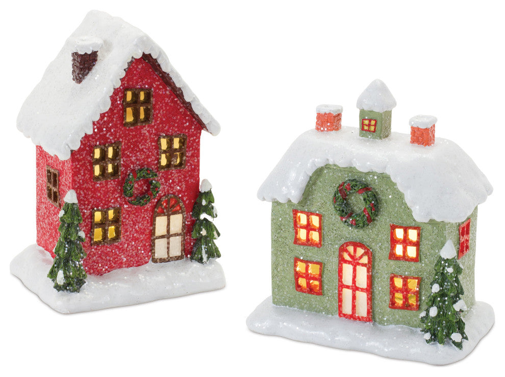 Get in the holiday spirit with this stunning set of Winter Village Houses! This cute-as-can-be lighted display piece is perfect for sprucing up your home during the festive season. Featuring bright red and green tones, a frosted glitter finish, and pine tree and wreath accents, these winter houses will bring some much needed Christmas cheer into your living space. Crafted from durable polyresin, you can enjoy these holiday houses for years to come. Get yours now!