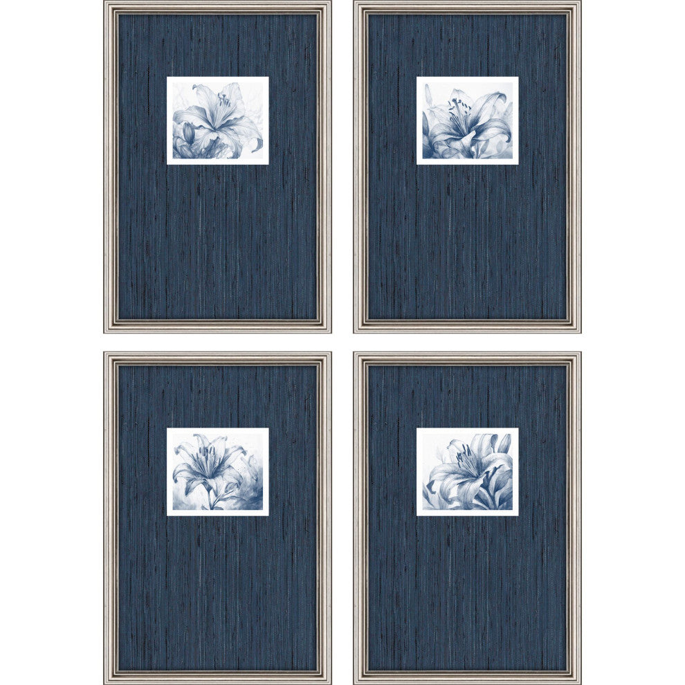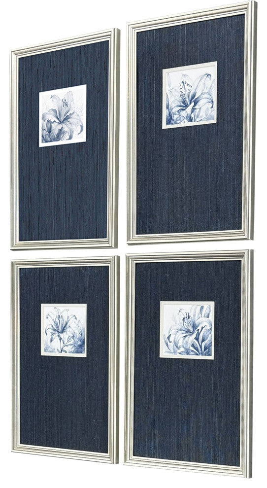 Blue lily blossoms are enhanced with a hand applied decorative blue grasscloth paper and offset matting. Framed in a classic silver leaf wood.