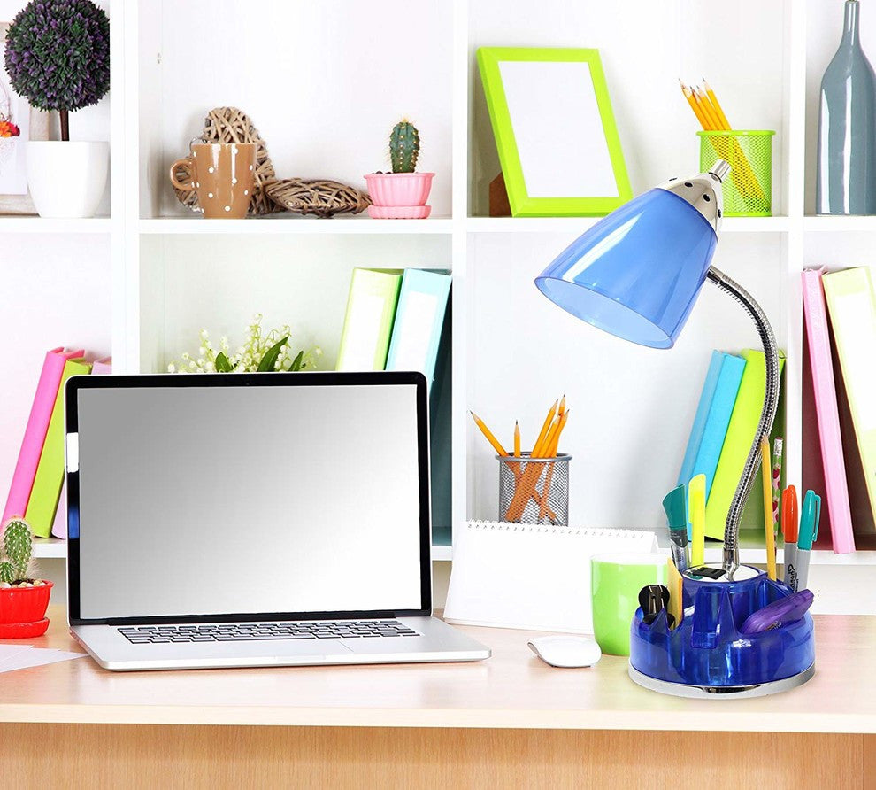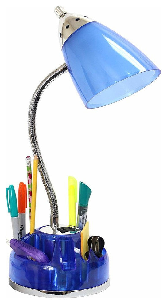 LimeLights Flossy Organizer Desk Lamp with Charging Outlet Lazy Susan Base Blue. Style and functionality meet with this fun organizer desk lamp with charging outlet. Comes equipped to hold many of the important essentials needed in a desk organizer as well as the ability to act as an additional outlet. The flexible chrome gooseneck allows you to point the light exactly where you need it. On/Off switch is located on the shade for convenience. Organizer includes compartments for storing pens, pencils, paper clips, etc. It also has a spot to plug in your phone, tablet, or other device. Perfect for office, kids room, or college dorm!Organizer Desk Lamp with Charging OutletFlexible gooseneckPerfect for office, kids room, or college dorm!Uses 1 x 40W Type A Medium Base Bulb (not included)L: 7.48" X W: 6.5" X H: 20"Power Outlet on base for charging your Cell phone, iPod, iPhone, iPadETLBulb Type: IncandescentSwitch Type: RotarySwitch Location: ShadeShade Diameter: 6.4Number of Lights: 1Maximum Wattage: 40Shade Material: PlasticCord Color: ClearFinish/Color: Clear BluePrimary Material (Leather, metal, wood): PlasticBase Type: E26 Medium BaseHeight from Base to Shade: 14.25"Bulb Included: NoWe don''t sale in California