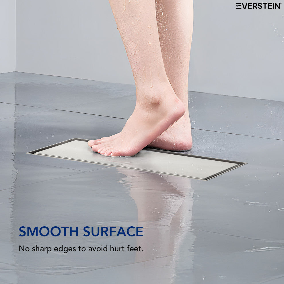 Elevate your bathroom experience with this modern linear shower drain. Made from premium SUS 304 stainless steel, it delivers a sleek, durable surface that resists corrosion, scratches, and stains. The high flow capacity supports up to 60L/min, effectively reducing stagnant water, foam buildup, and unpleasant odors. Featuring a "V" channel design for faster drainage and a removable hair strainer to prevent clogging, this drain ensures efficiency and hygiene. Its reversible cover offers two stylish options for versatile installation. Complete with easy-to-remove parts for effortless cleaning and maintenance. Perfect for walk-in showers, wet rooms, and modern bathrooms seeking both function and minimalist style.Feature:1. Protect Your Feet: Precision-crafted edges eliminate sharpness to prevent injury while walking barefoot.2. For a Cleaner, Drier Bathroom: High flow rate up to 60L/min reduces standing water and prevents bacterial growth and bad odors.3. Prevent Clogs: Built-in stainless steel hair strainer captures hair and debris, ensuring consistently fast drainage.4. Customize Your Look: Reversible cover panel lets you choose between an elegant finish or a fully integrated tile-in look.5. Enjoy Long-Lasting Durability: Made from SUS 304 stainless steel with advanced electroplating technology for scratch resistance and corrosion protection.6. Simplify Cleaning and Maintenance: Easy disassembly design lets you lift the cover and clean the filter without tools for hassle-free upkeep.After-Sales Warranty:EVERSTEIN backs this faucet with a lifetime warranty covering all manufacturing defects (excluding human error and accidental damage). Our dedicated support team is ready to assist you whenever needed, offering lasting peace of mind.