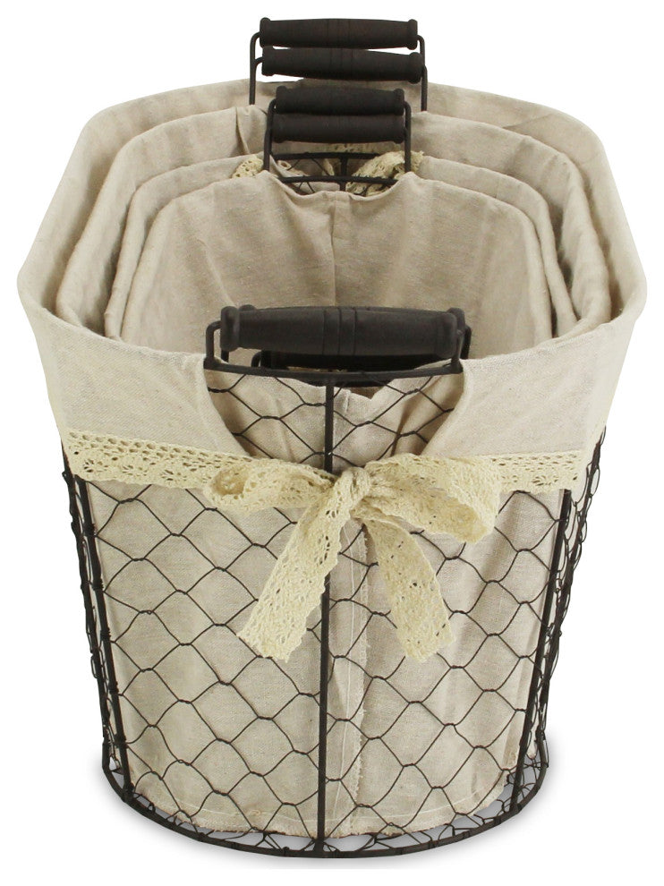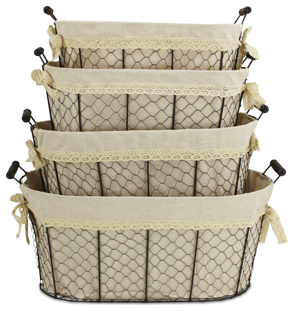 Add a touch of farmhouse charm to your home with the Lined Oval Wire Baskets. Perfect for storage or as stand-alone decorative pieces, the Lined Oval Wire Baskets are a stunning addition to your living room, bedroom or bathroom. With a striking, black wire body, the Lined Oval Wire Baskets feature a tan linen lining that provides a unique contrast against its more industrial body. Simple yet elegant, the Lined Oval Wire Baskets are sold as a set of four and will effortlessly complement your farmhouse home decor. Dimensions: Extra Large: 20.5"x10.25"x9.5", Large: 17.75"x9.25"x8.25", Medium: 16.5"x8.25"x7", Small: 15"x8"x6.5"